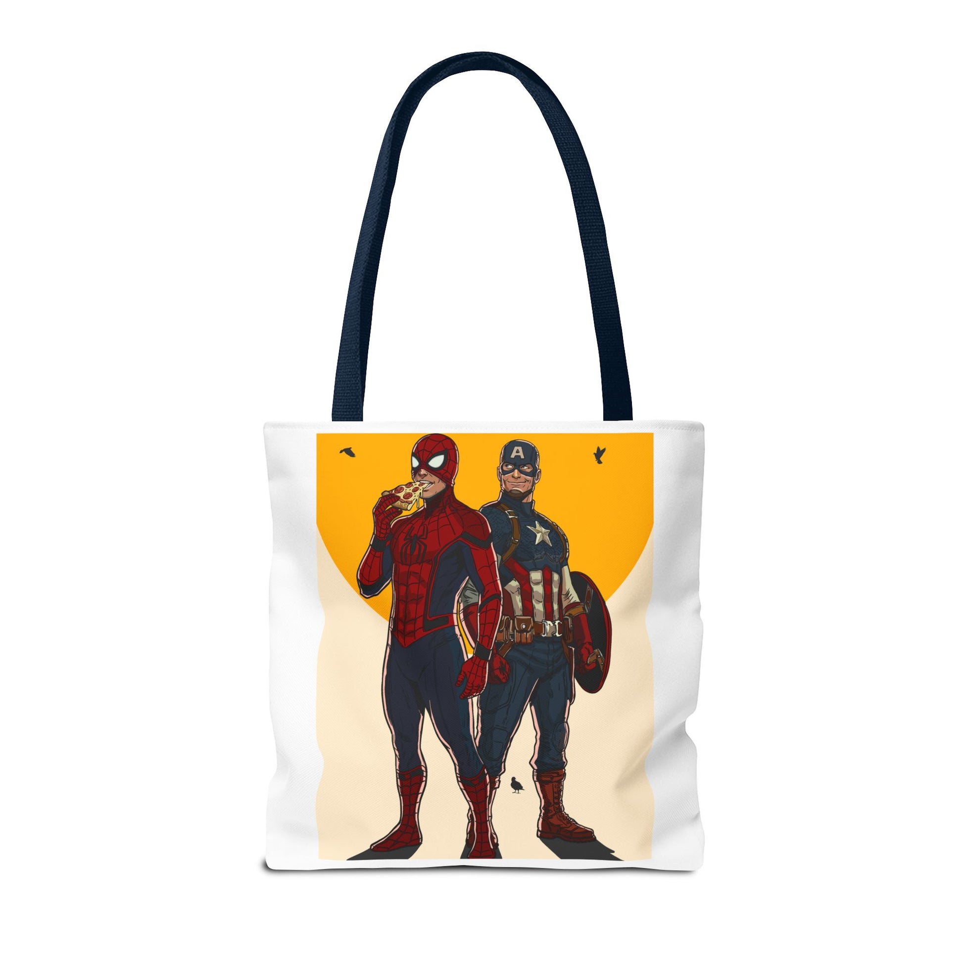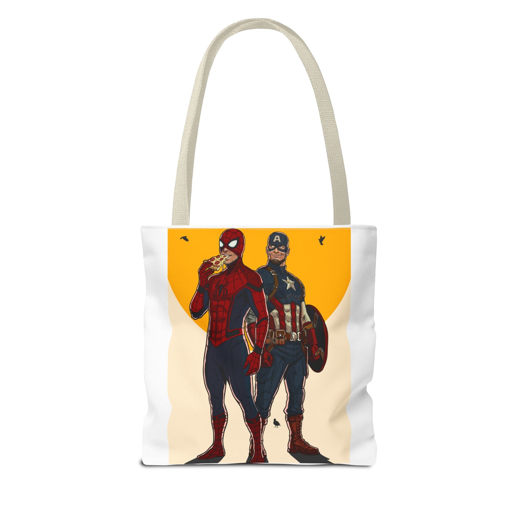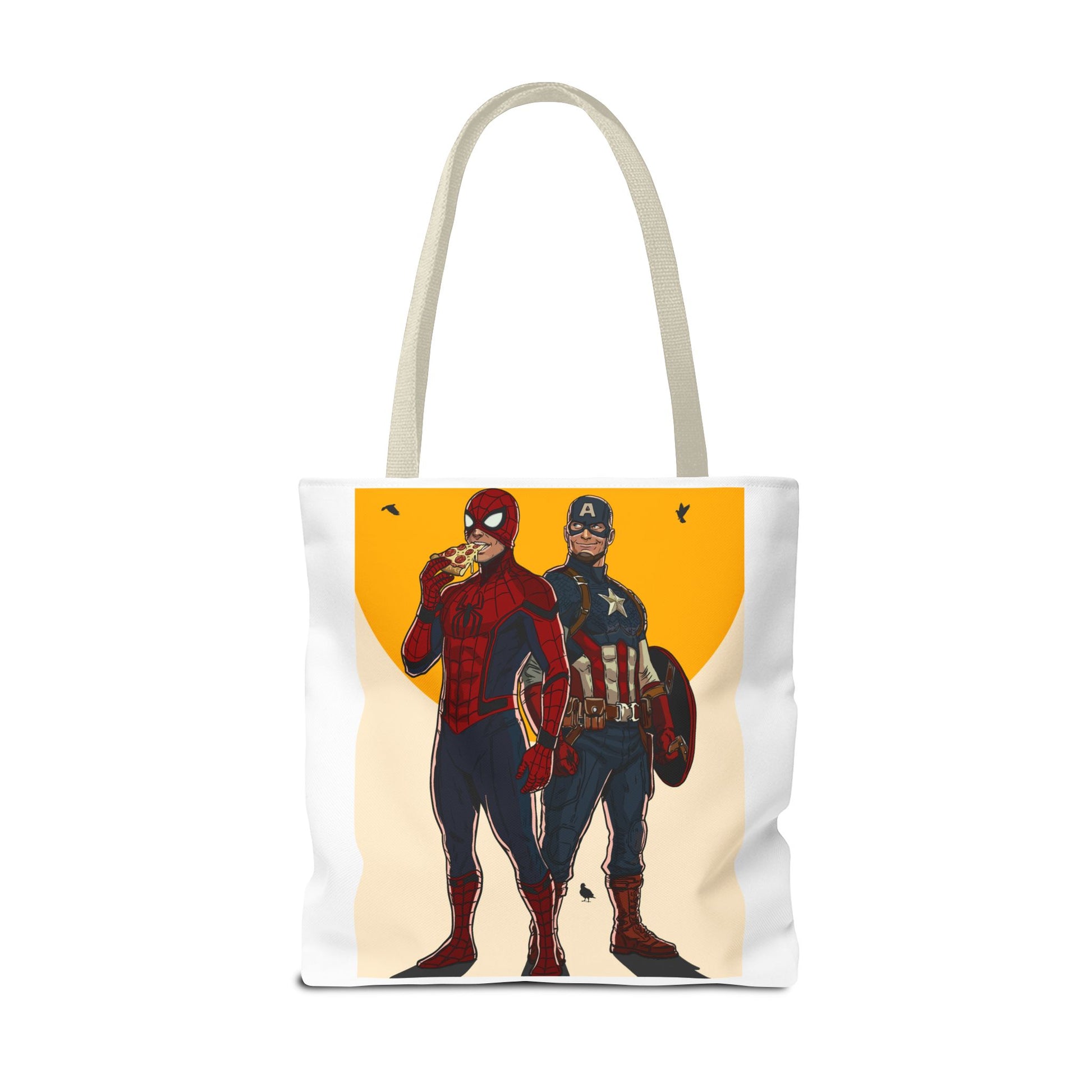 This roomy, durable tote brings playful superhero energy into everyday errands. The bold illustration on the front shows two masked heroes standing side by side under a warm, graphic sun — one casually munching on a slice of pizza while the other steadies a shield. The result is a fun, slightly cheeky statement piece that holds groceries, books, or weekend gear without weighing you down. Boxed corners give it extra capacity; reinforced handle stitching keeps heavy loads secure. Choose a handle color to match your style and carry a little comic-book swagger wherever you go.