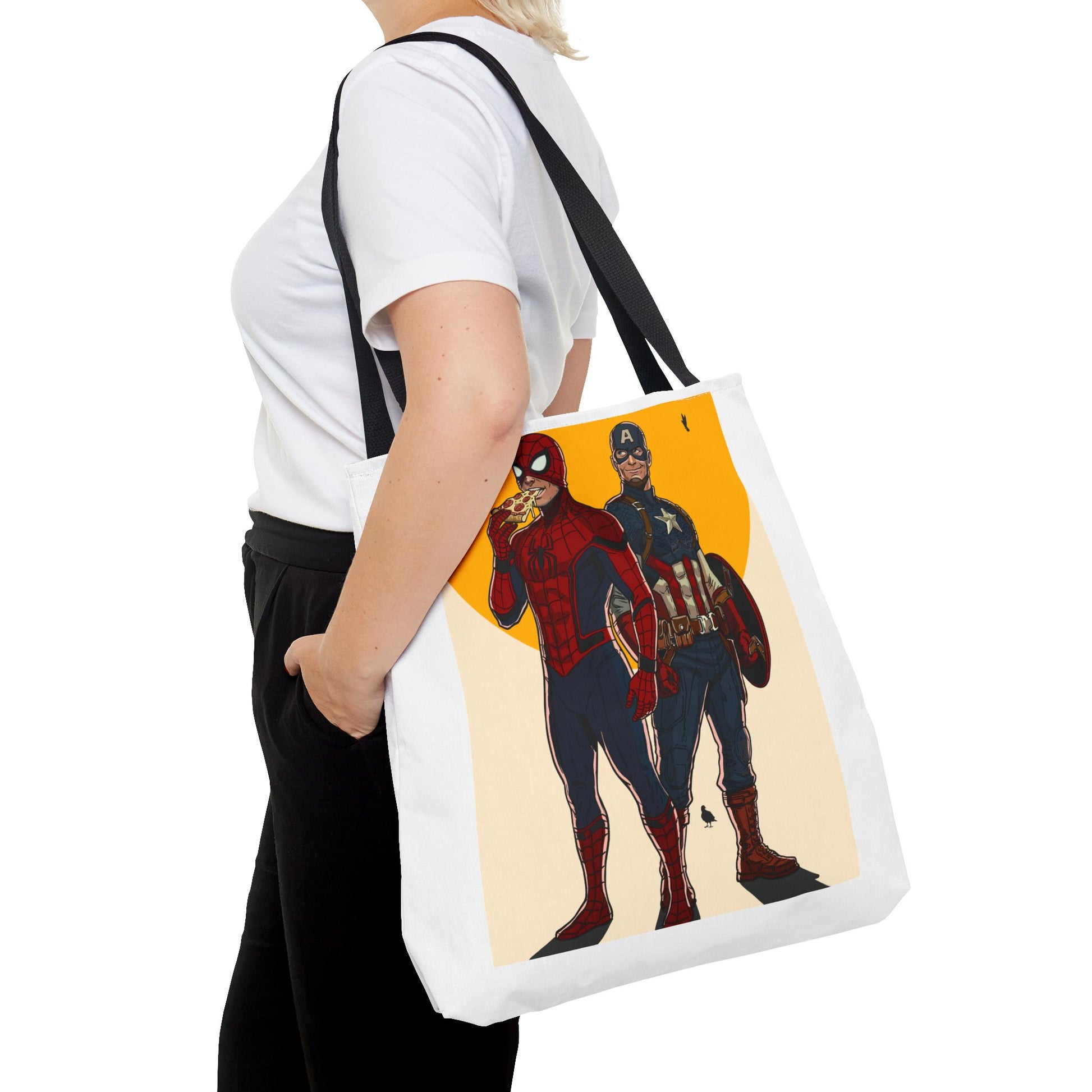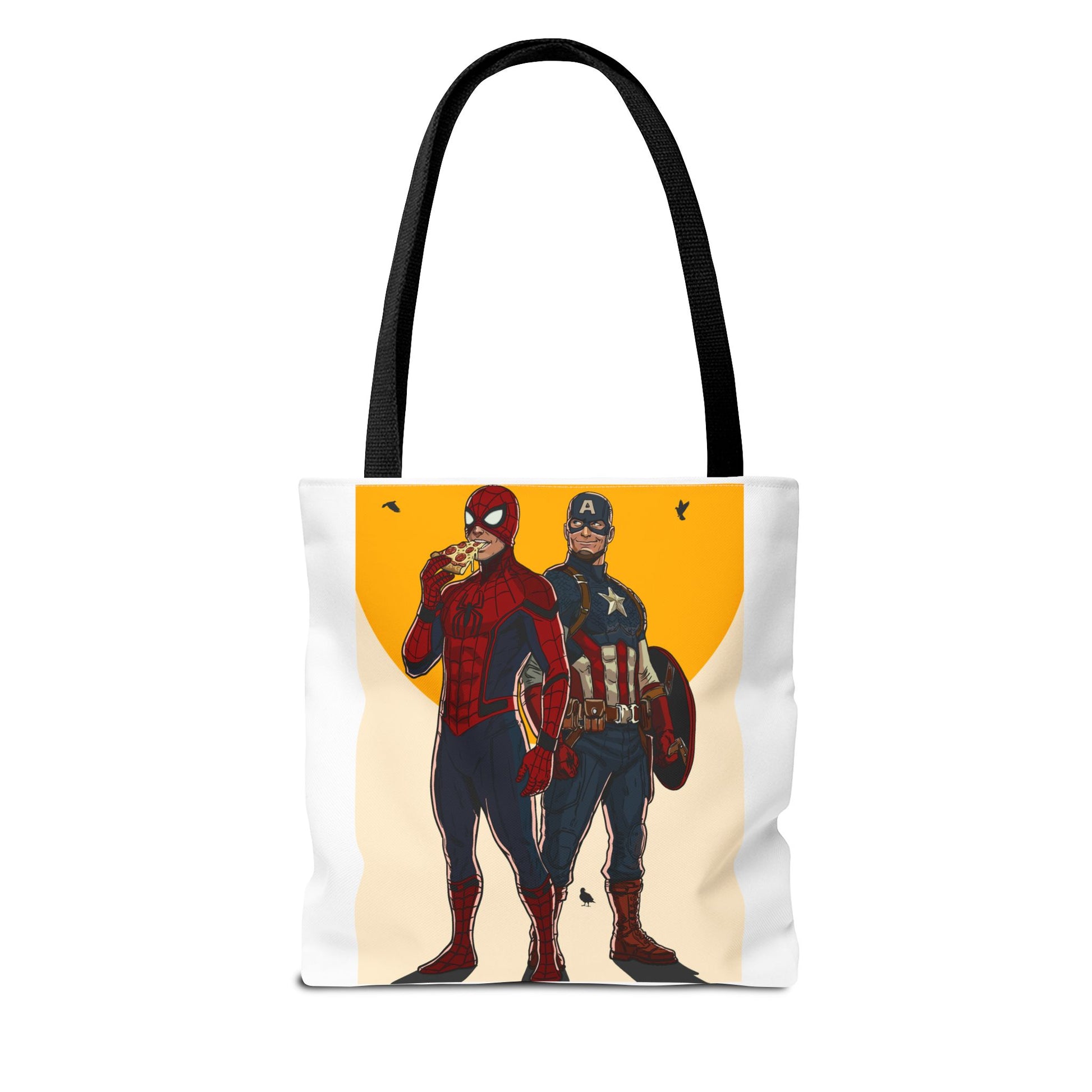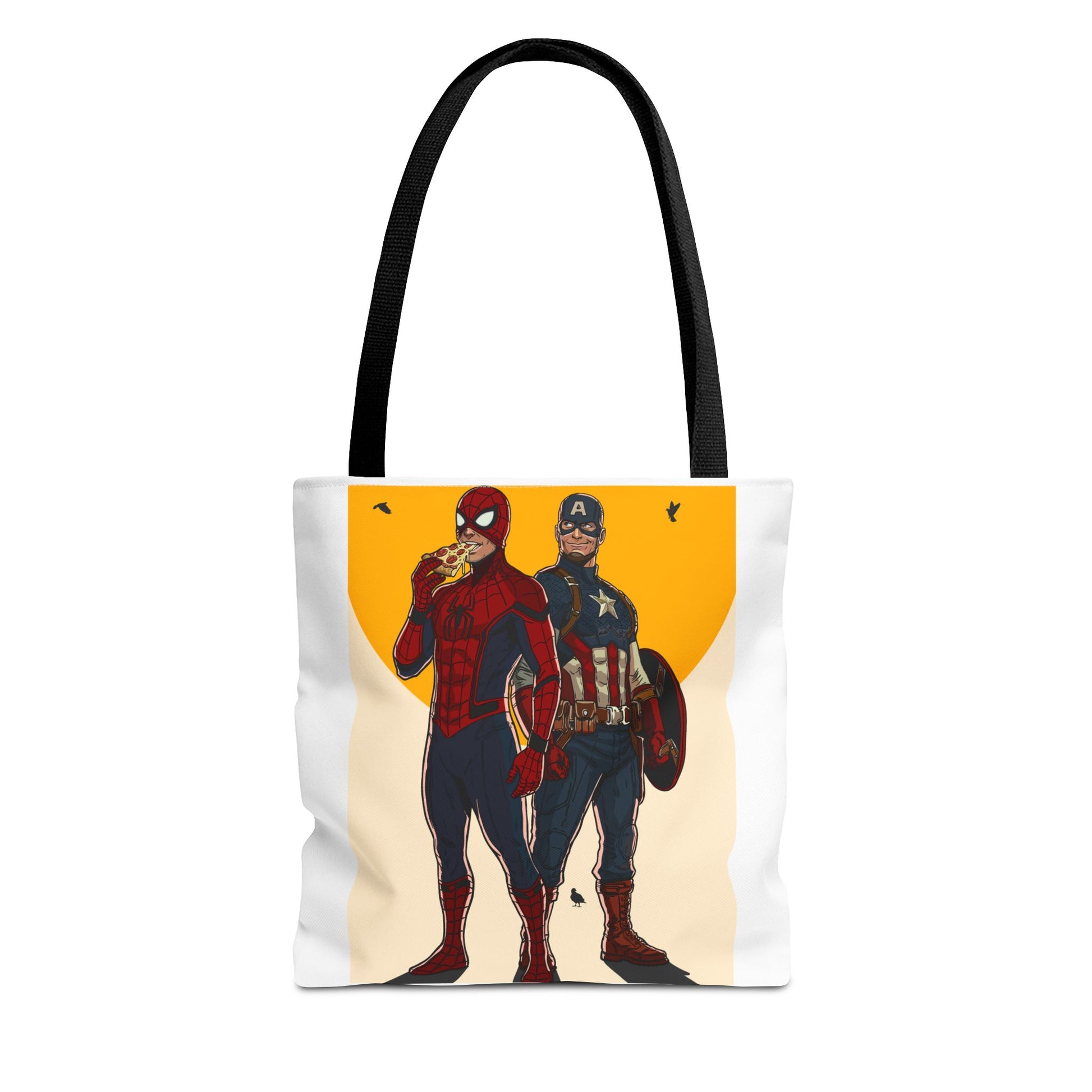 This roomy, durable tote brings playful superhero energy into everyday errands. The bold illustration on the front shows two masked heroes standing side by side under a warm, graphic sun — one casually munching on a slice of pizza while the other steadies a shield. The result is a fun, slightly cheeky statement piece that holds groceries, books, or weekend gear without weighing you down. Boxed corners give it extra capacity; reinforced handle stitching keeps heavy loads secure. Choose a handle color to match your style and carry a little comic-book swagger wherever you go.