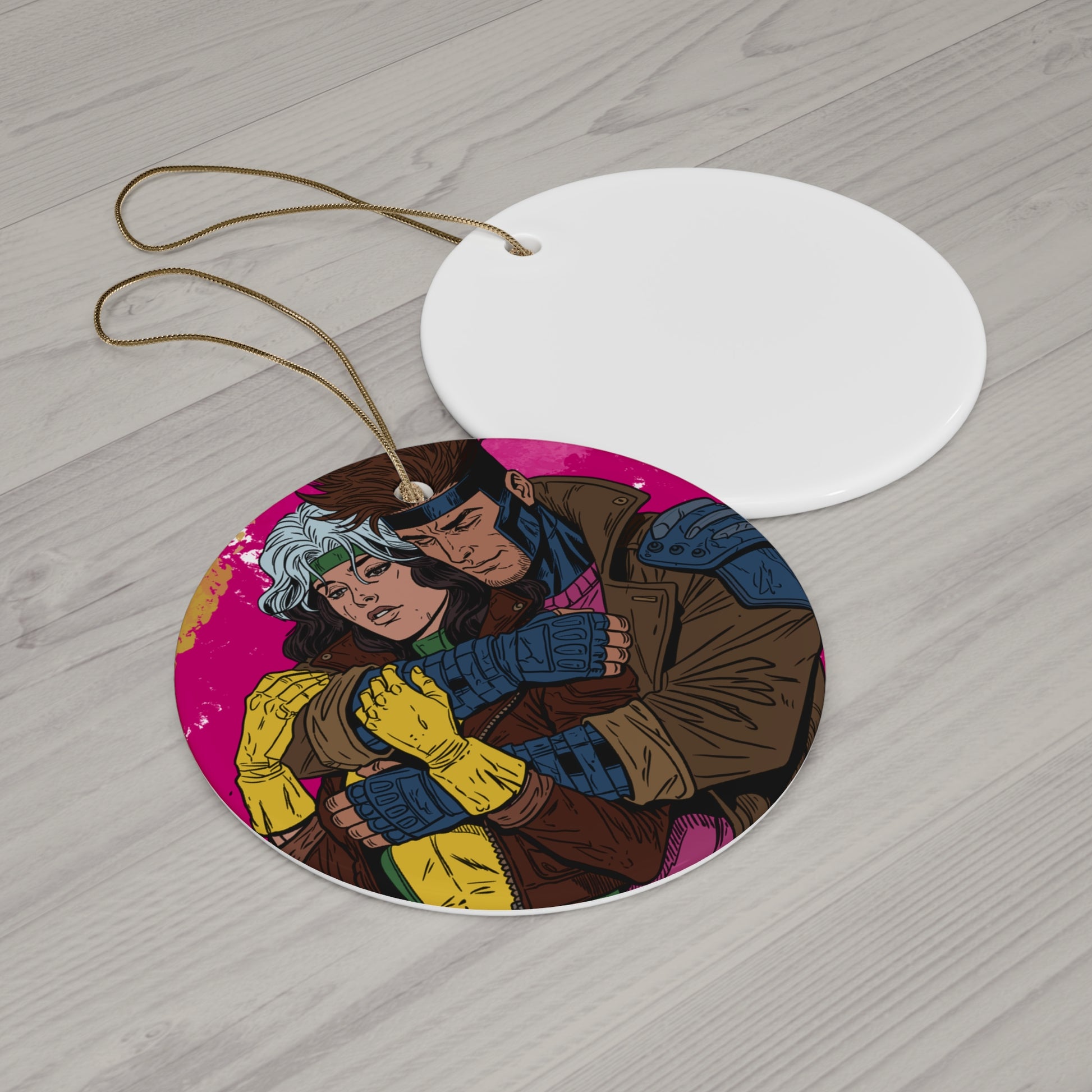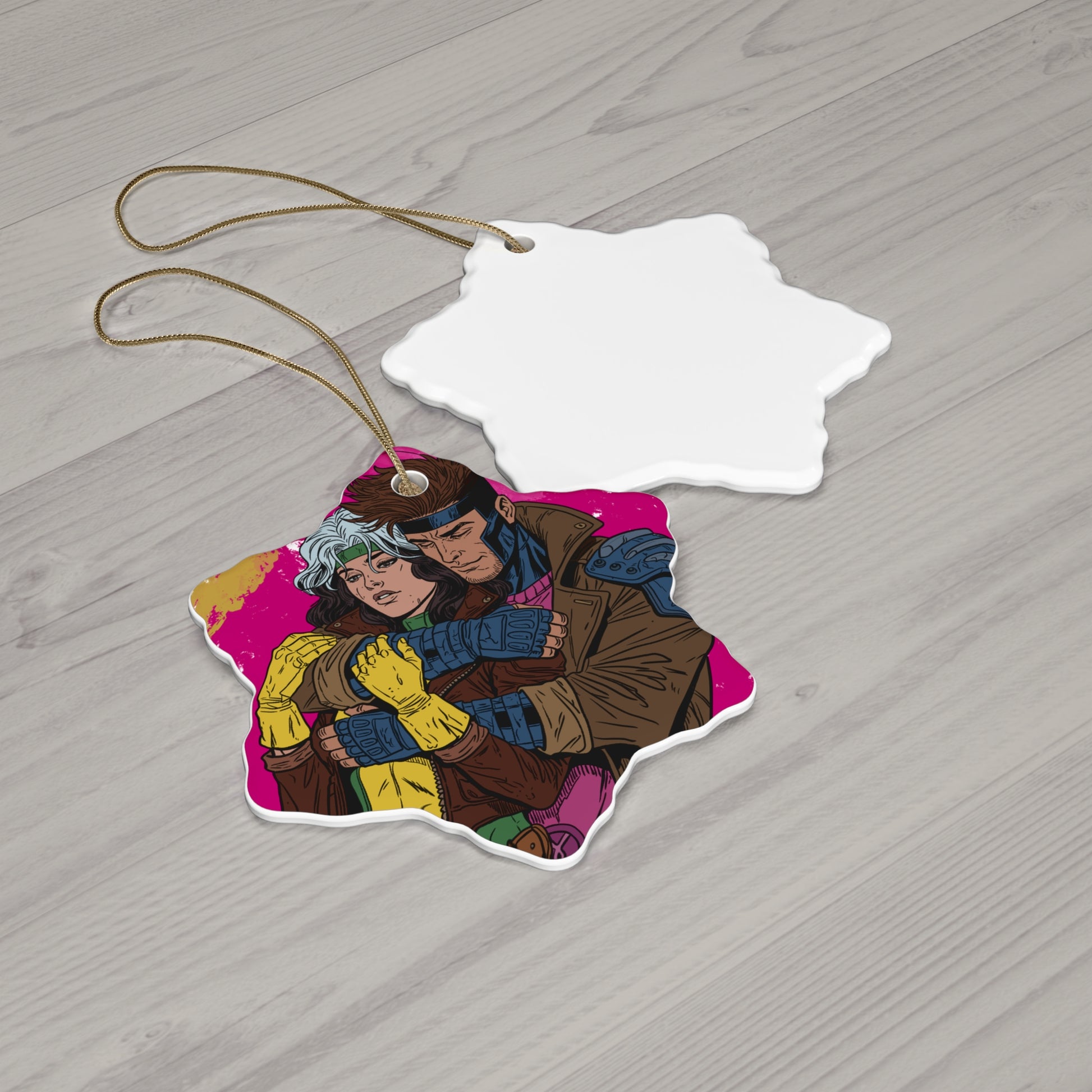 A lovingly illustrated ceramic ornament capturing the Cajun Thief and his Southern Belle in a tender, romantic embrace. The glossy, full-color print brings their expressions and costume details to life, framed on your choice of snowflake, star, heart, or circle. Lightweight but solid, the single-piece ceramic holds vivid color without worry of peeling or separating. Hung by the included gold-toned string, this ornament adds a warm, fan-focused charm to holiday trees, themed displays, or year-round shelves. Small variations in the hole placement and the one-sided print give each piece a handmade feel, making it a meaningful keepsake for collectors and fans who cherish quiet, intimate moments between their favorite characters.