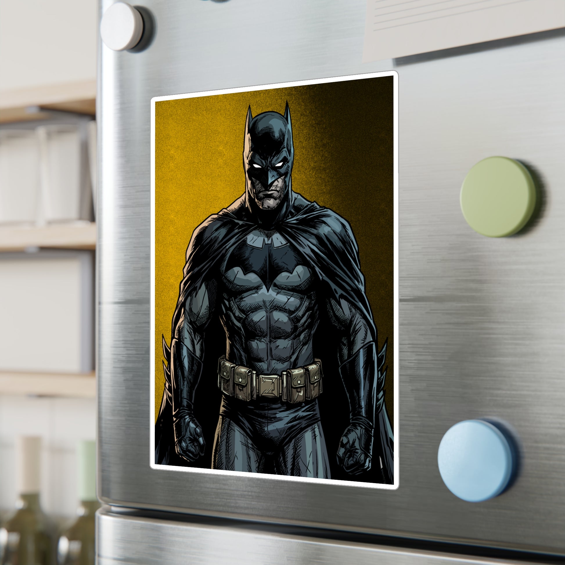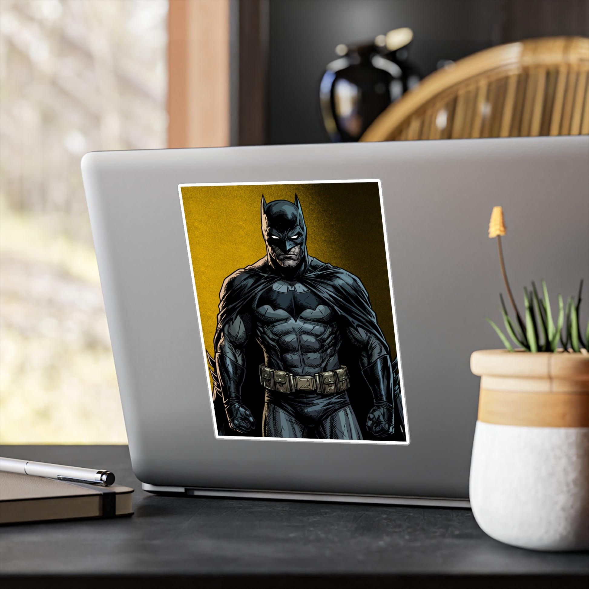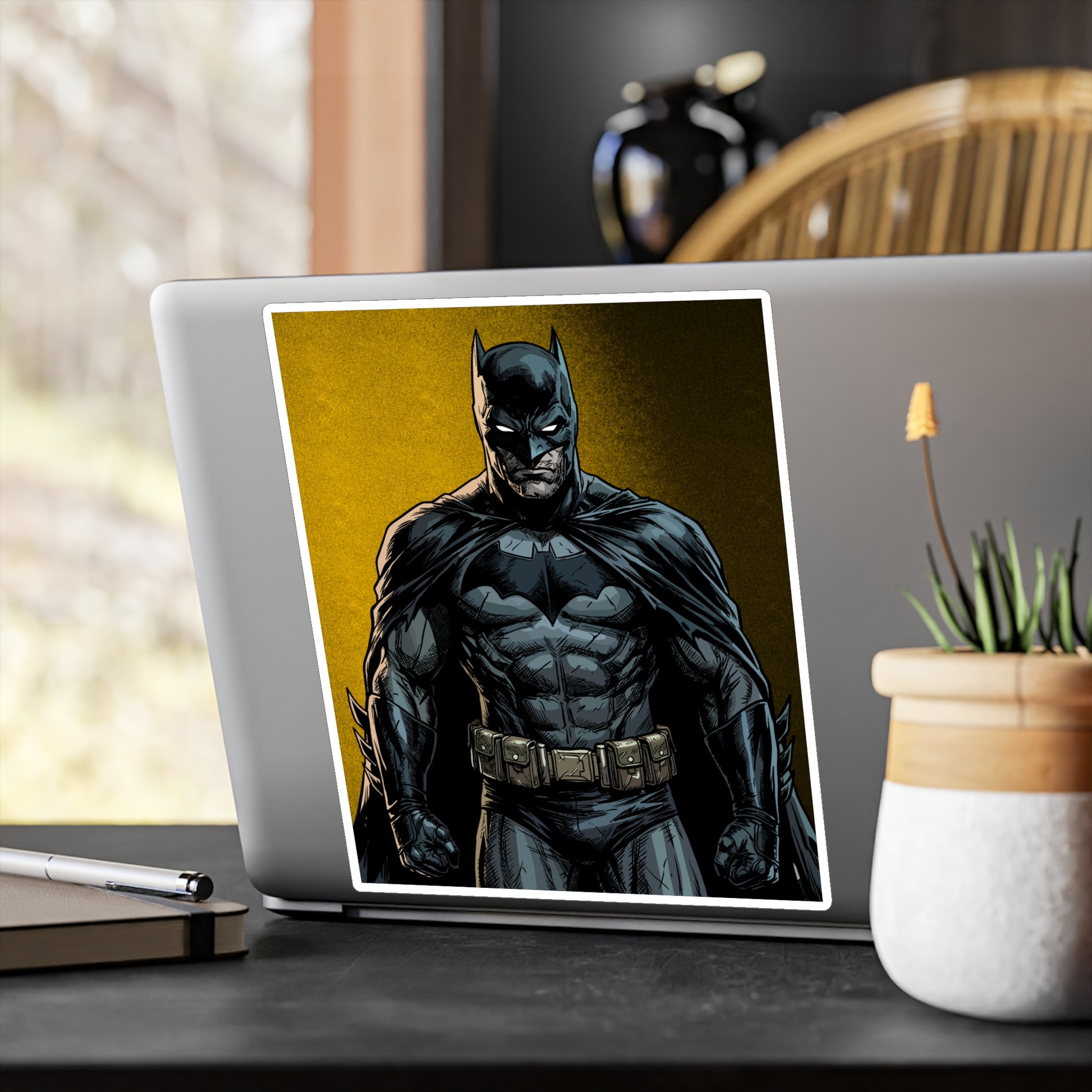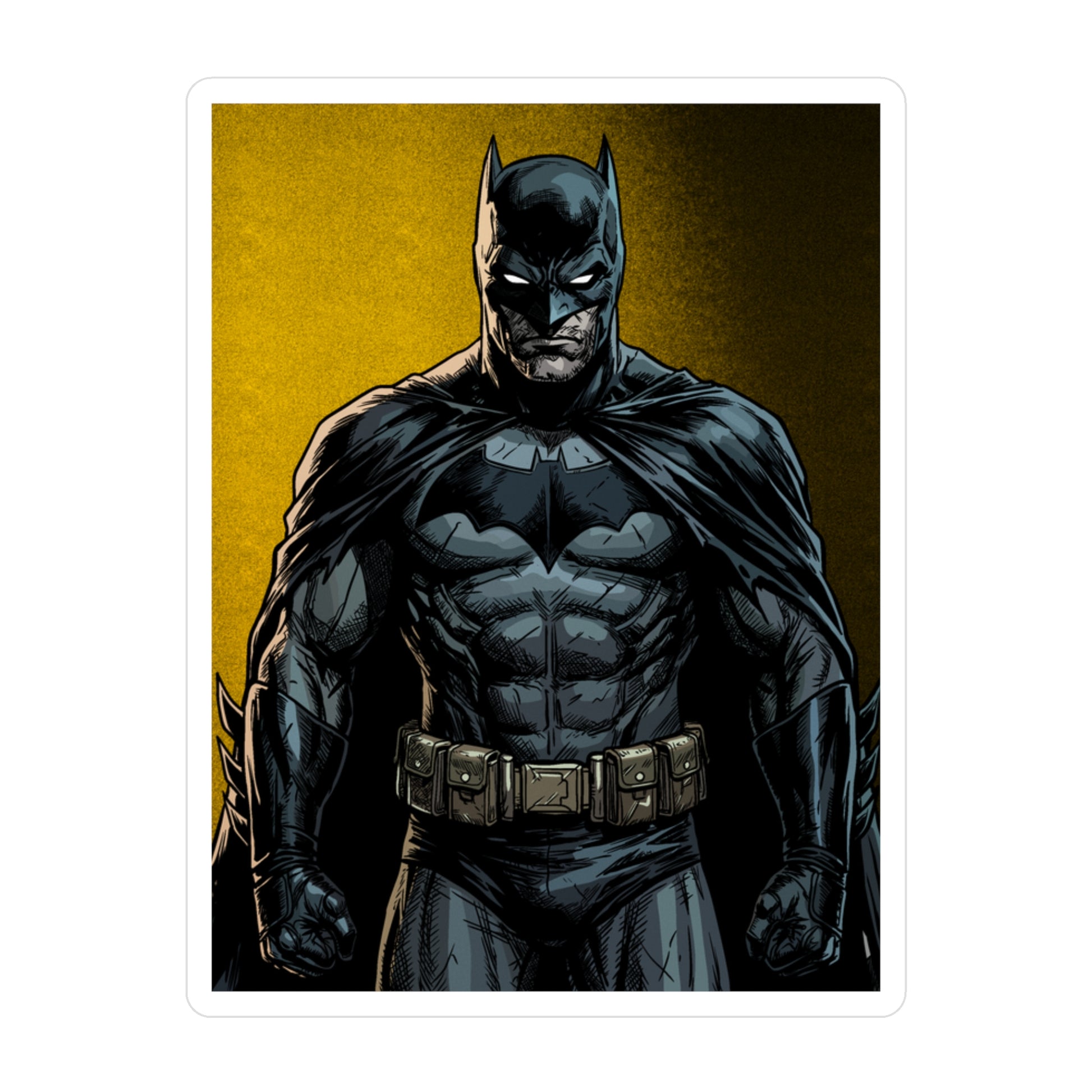 A bold, satin-finish vinyl decal that brings a dramatic, comic-style hero vibe to your laptop, water bottle, or window. The removable adhesive makes it easy to apply and reposition without sticky residue, while the 1/8" kiss-cut white border gives the art a clean, framed look. Colors stay vivid outdoors thanks to water-, scratch-, and UV-resistant printing that holds up for years. The decal’s finely detailed printing and satin surface add depth and texture, making darker tones pop against the subtle white outline. Note small, closely spaced details may merge during cutting and very light colors can show a slight grain from the print process.