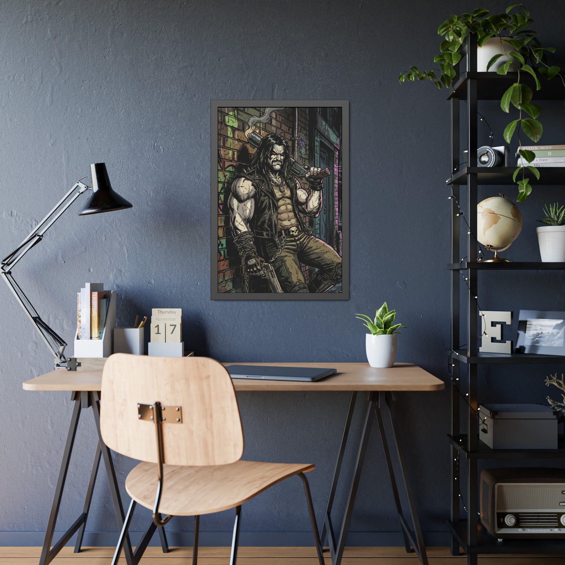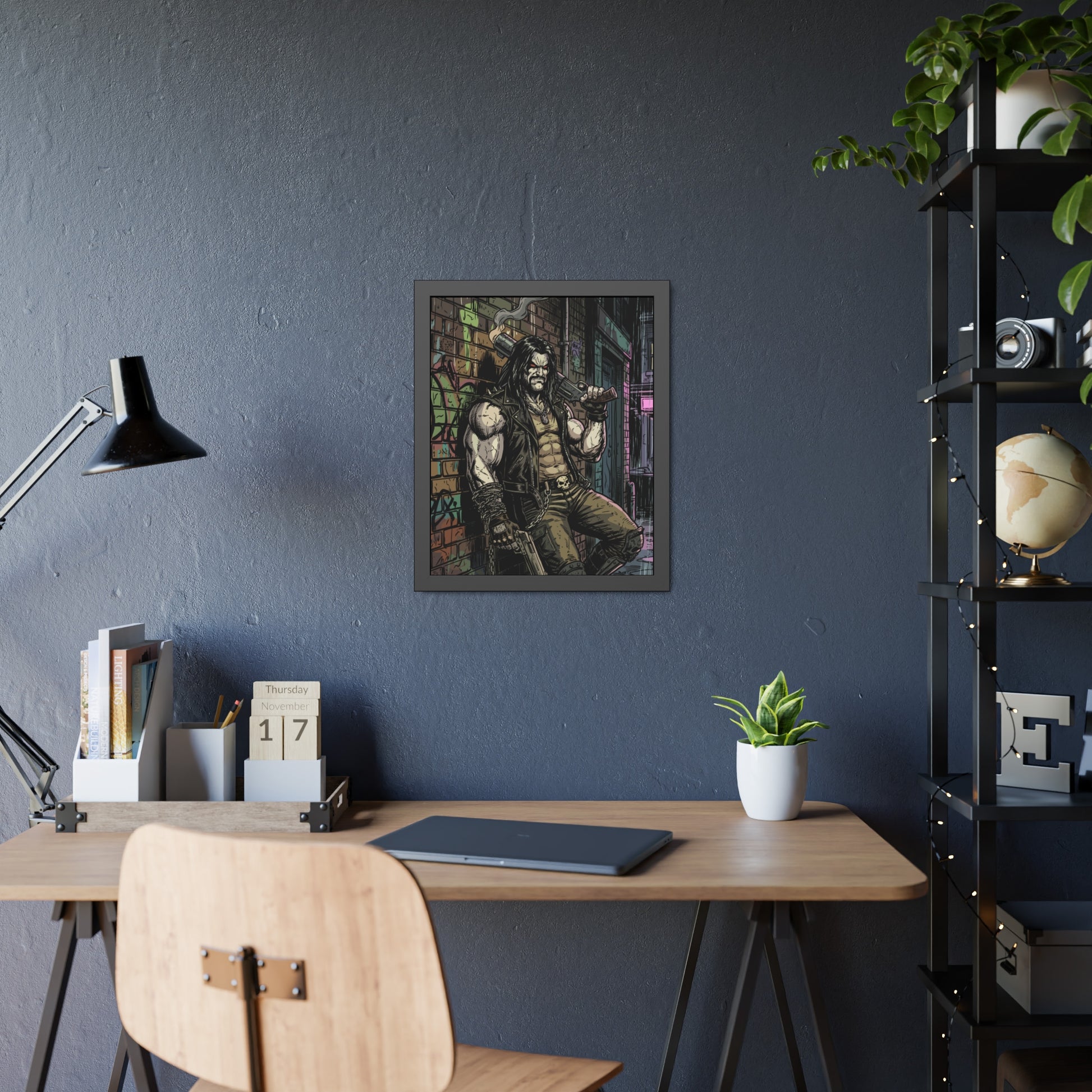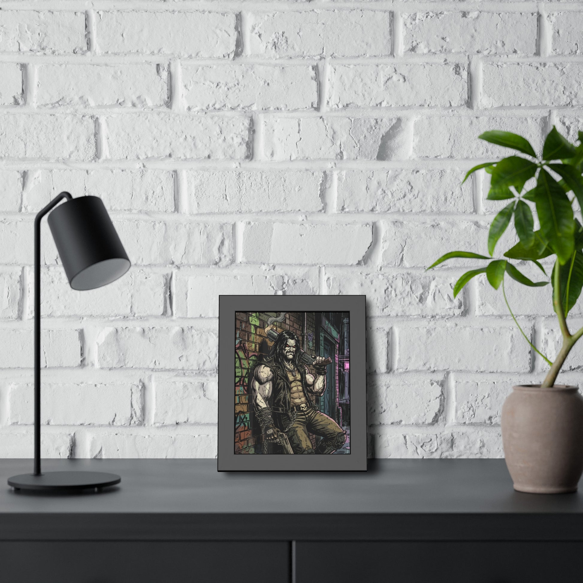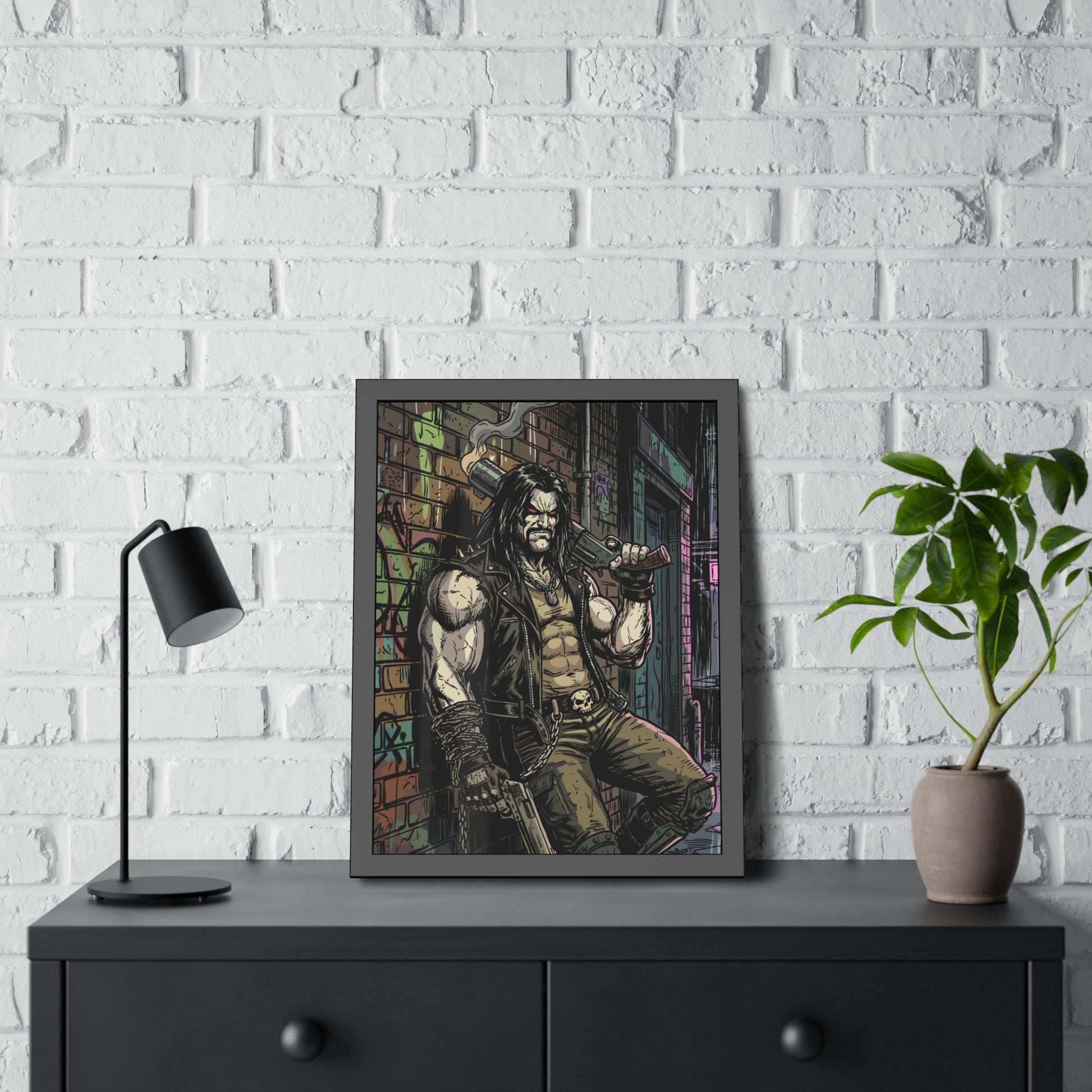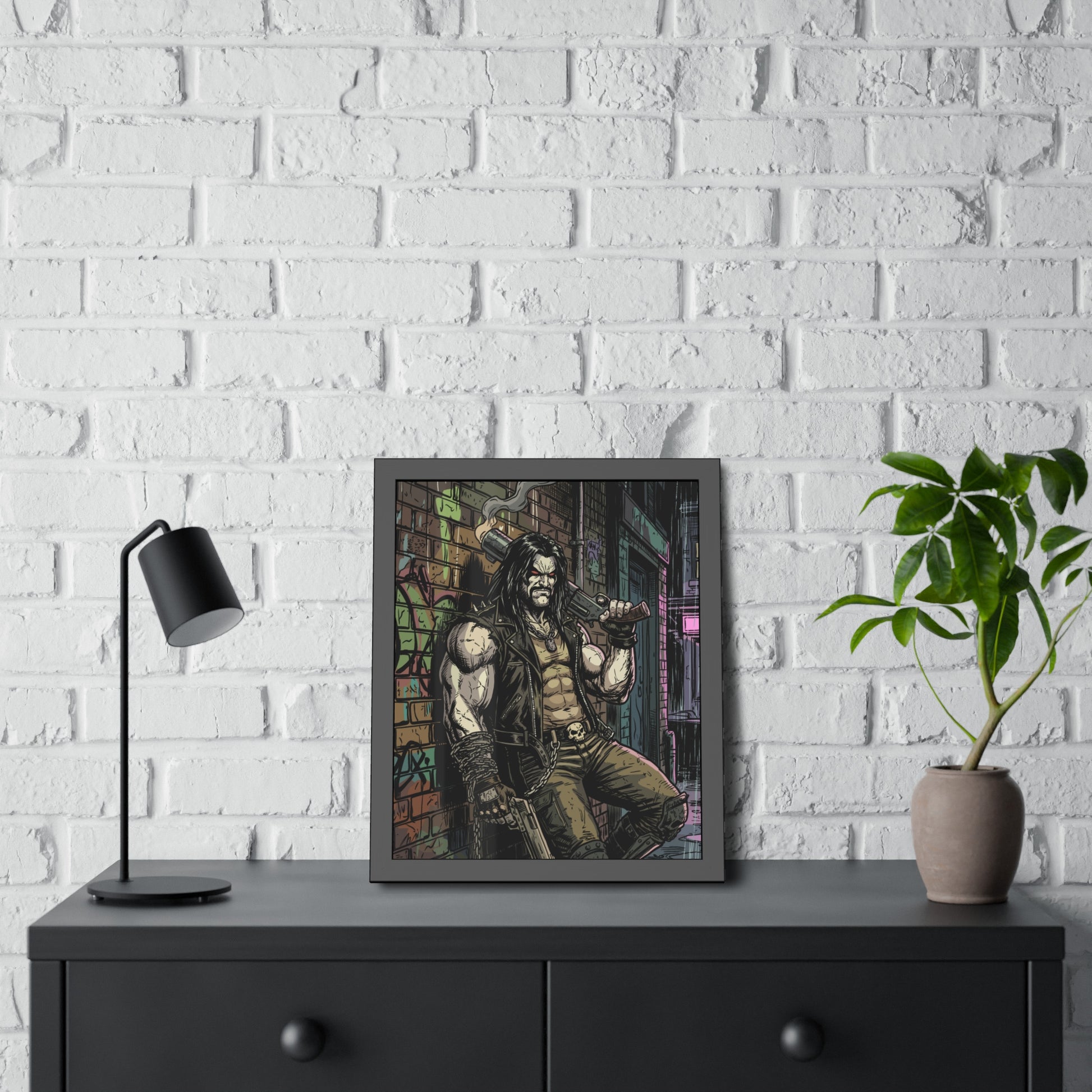 This framed paper poster brings gritty, comic-book energy into your space. Printed with vivid inks on your choice of fine art or semi-gloss paper, the artwork’s shadows and neon highlights stay rich and detailed behind a matte-black pine frame and shatter-proof plexiglass. It arrives ready to hang with pre-installed hardware and rubber bumpers, so you can mount it quickly in a studio, game room, or hallway where its raw, urban vibe can set the tone. Sizes and orientation options let you place it as a bold centerpiece or part of a curated gallery wall.