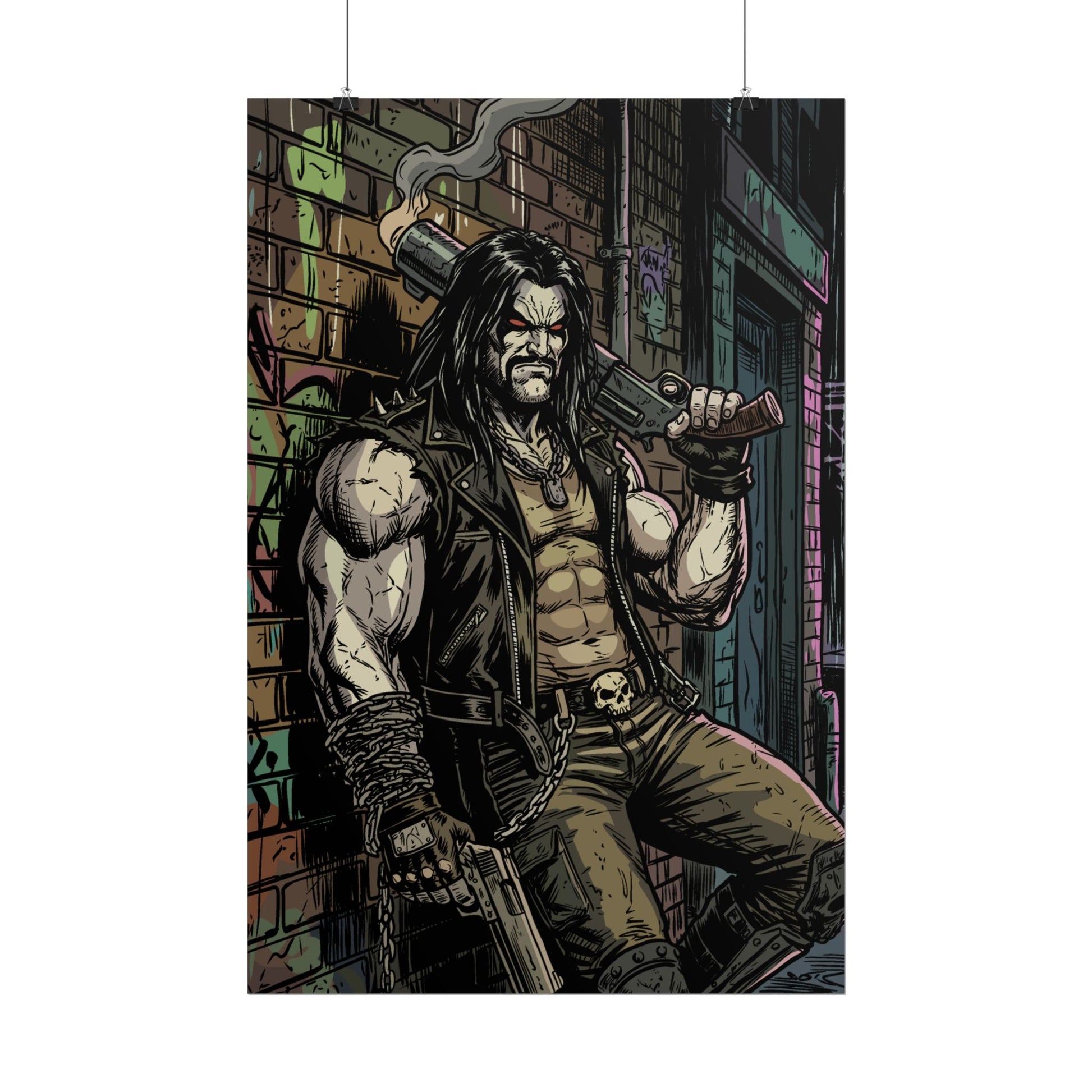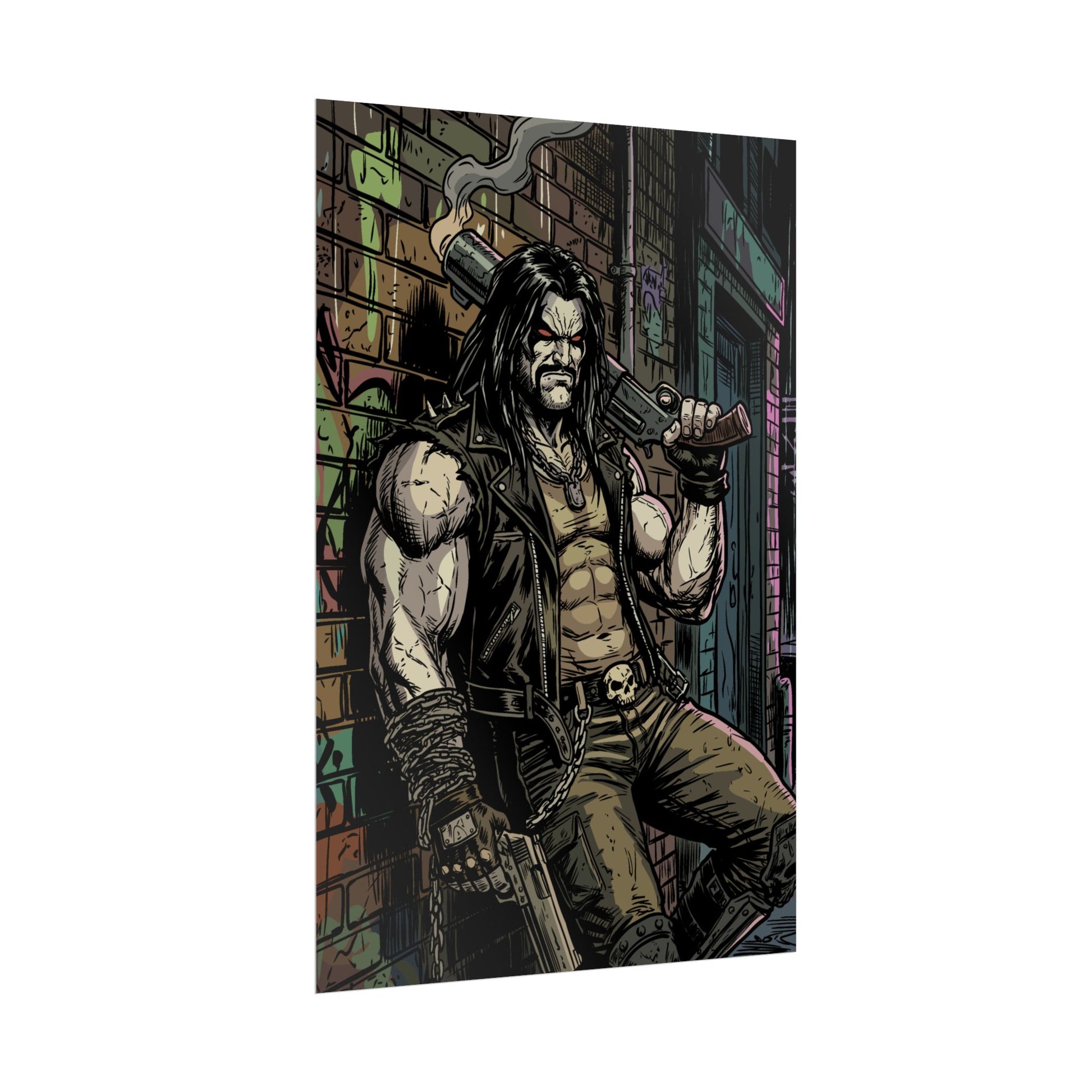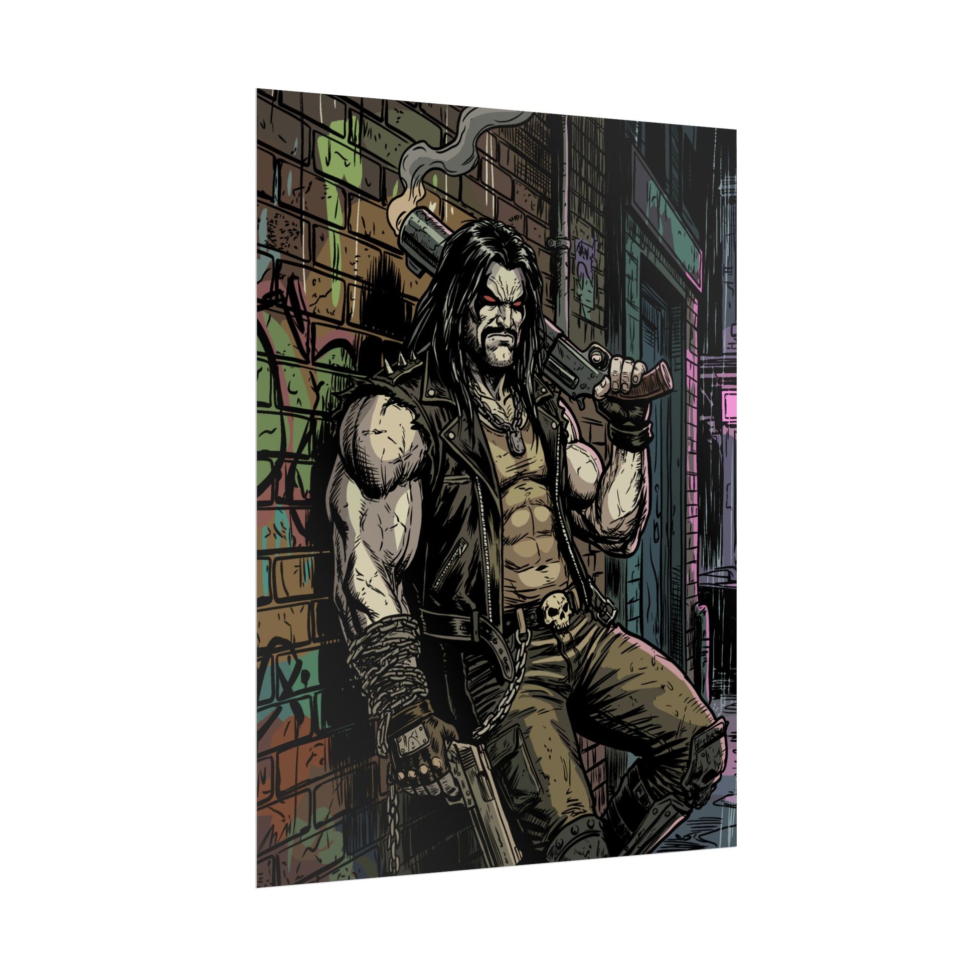 This rolled poster brings gritty urban comic energy to your wall. Printed with vibrant giclée inks on your choice of fine art, semi-glossy, or matte paper, the image pops with deep contrast and preserved detail — from the weathered brick and neon back-alleys to the tough-as-nails protagonist leaning against the wall. Available in multiple sizes and orientations, it arrives rolled for easy framing or gallery-style hanging. Choose fine art paper for textured, archival character; semi-glossy for crisp, saturated color; or matte for a toned, low-glare finish that suits a darker, moodier palette.