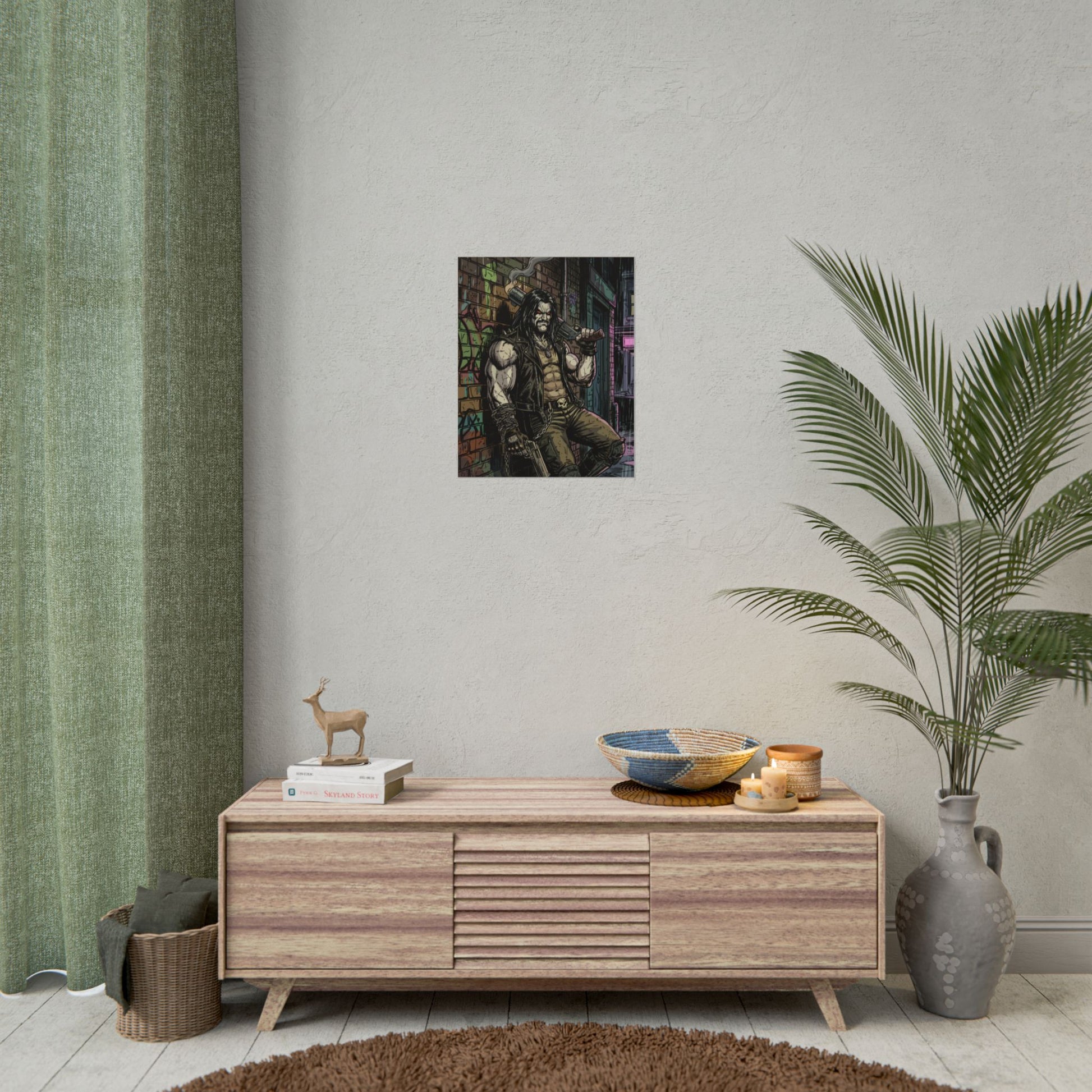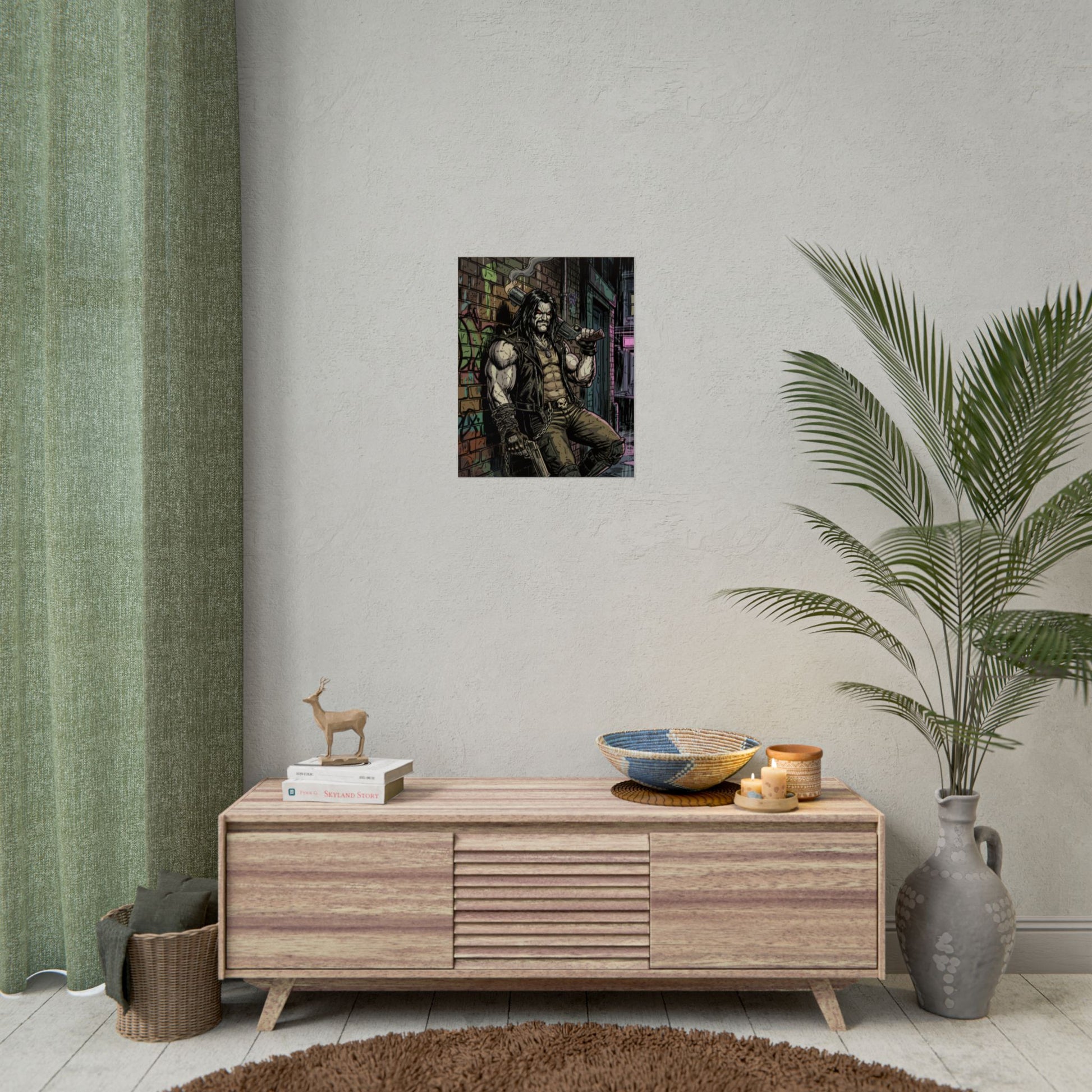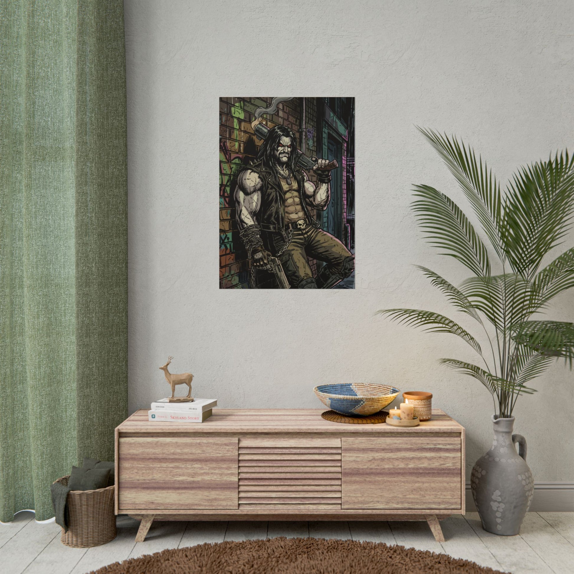 This rolled poster brings gritty urban comic energy to your wall. Printed with vibrant giclée inks on your choice of fine art, semi-glossy, or matte paper, the image pops with deep contrast and preserved detail — from the weathered brick and neon back-alleys to the tough-as-nails protagonist leaning against the wall. Available in multiple sizes and orientations, it arrives rolled for easy framing or gallery-style hanging. Choose fine art paper for textured, archival character; semi-glossy for crisp, saturated color; or matte for a toned, low-glare finish that suits a darker, moodier palette.