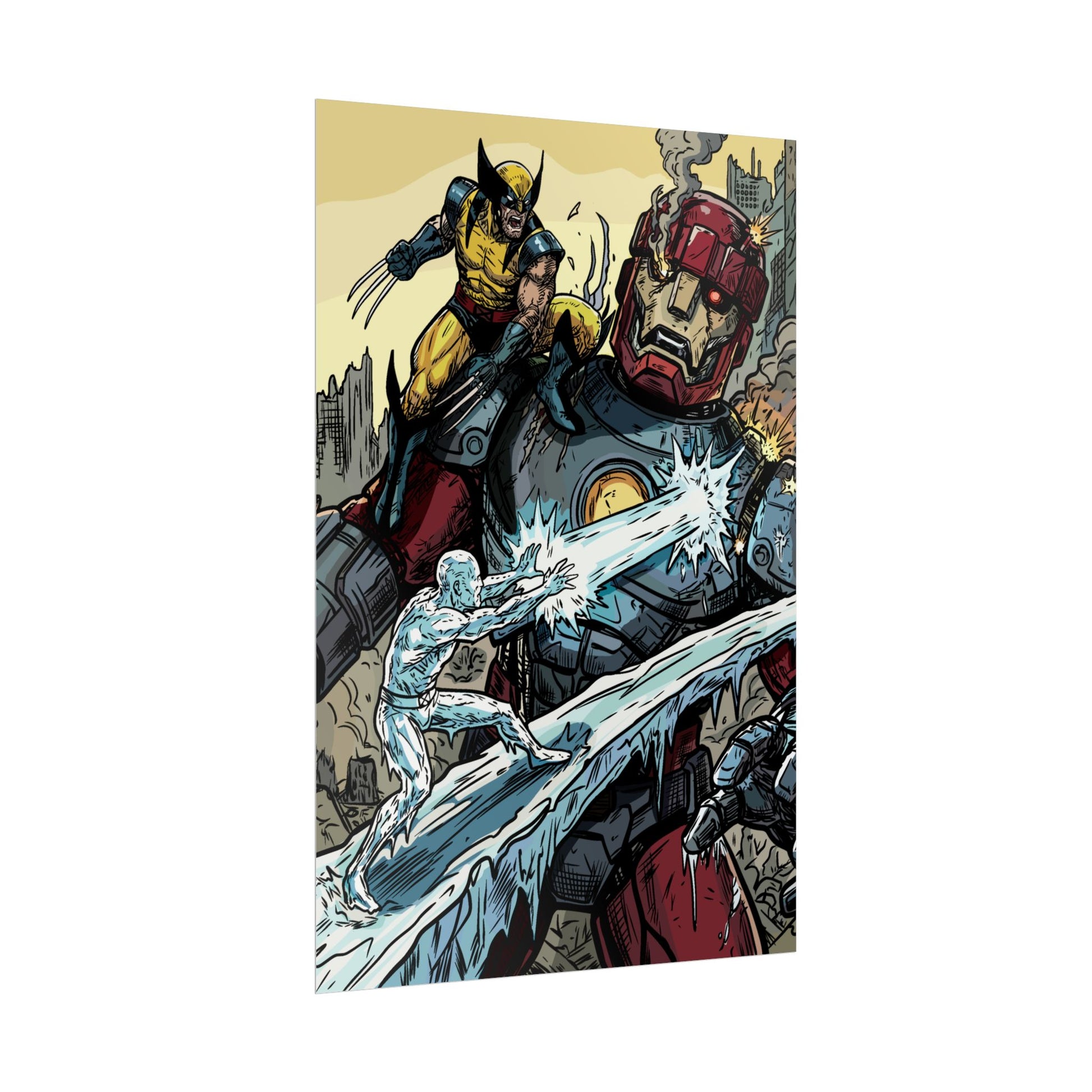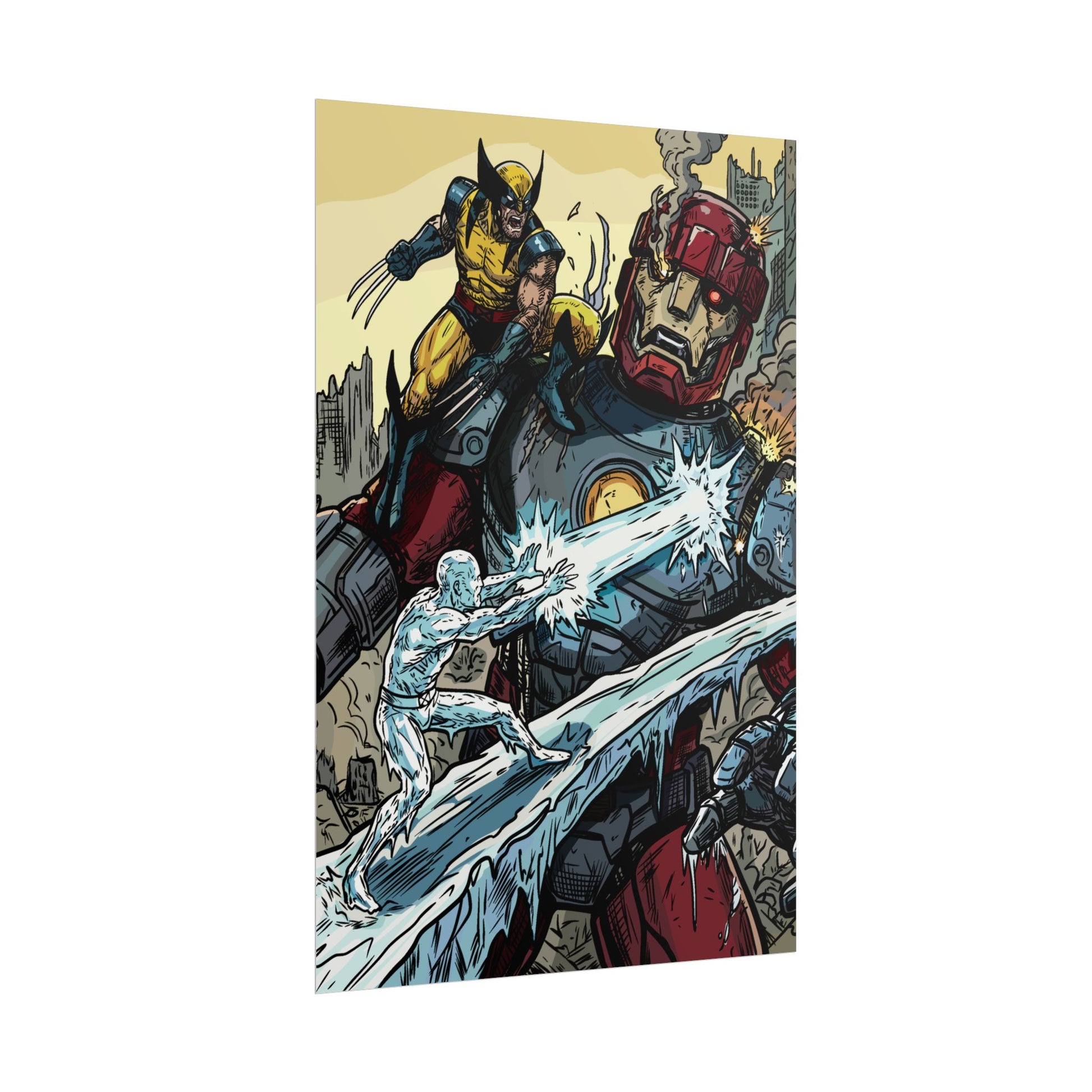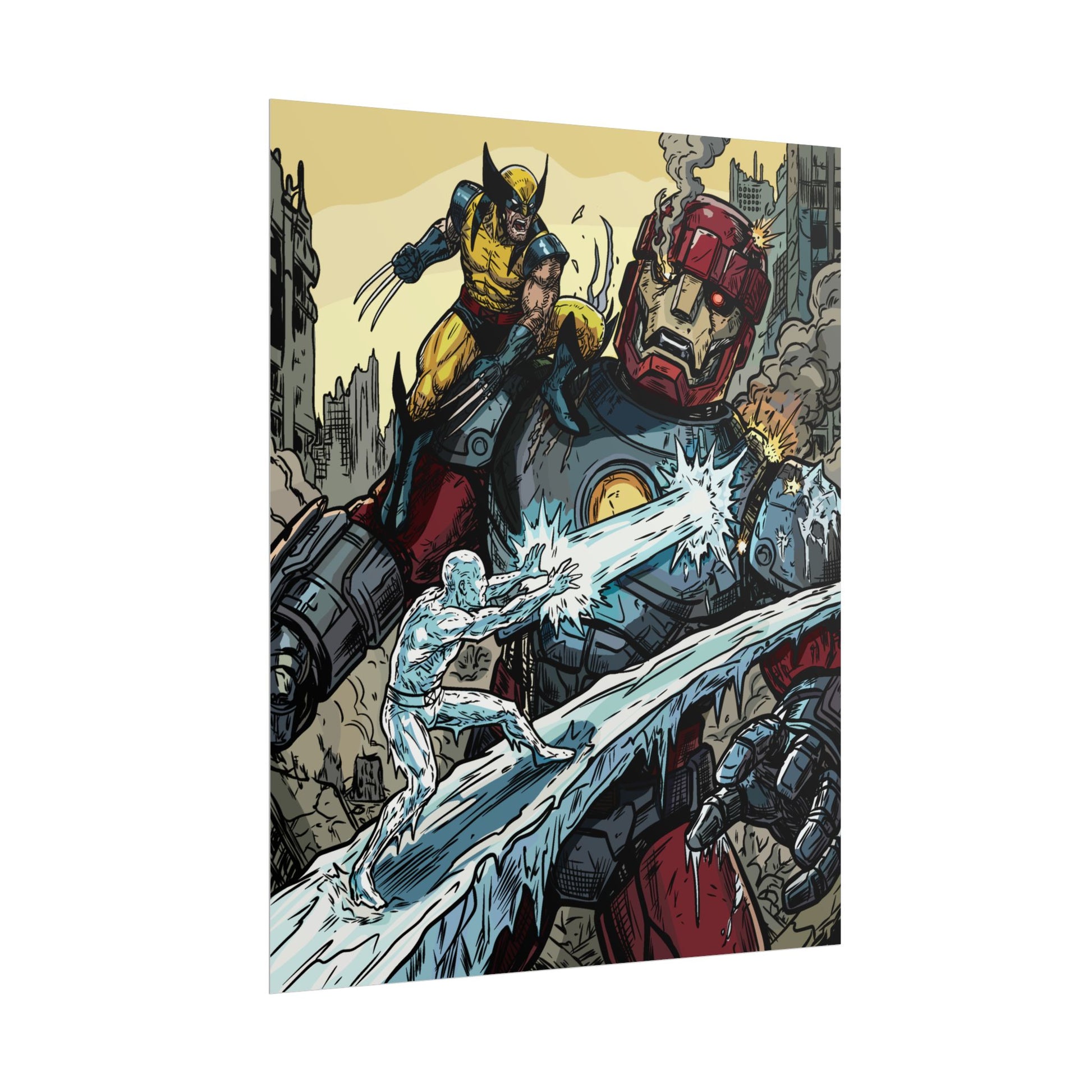 A bold, high-impact poster that brings comic-book energy to any wall. The artwork crackles with motion — a fierce hero leaping across a fractured cityscape while icy powers collide with a towering armored giant. Printed with rich giclée color on your choice of textured fine art, semi-glossy photo, or understated matte paper, each print holds vivid detail and strong contrast that make every line and splash of color pop. Rolled for safe shipping, this poster arrives ready to frame or clip and hang, adding an instant focal point to a studio, den, or fan wall.