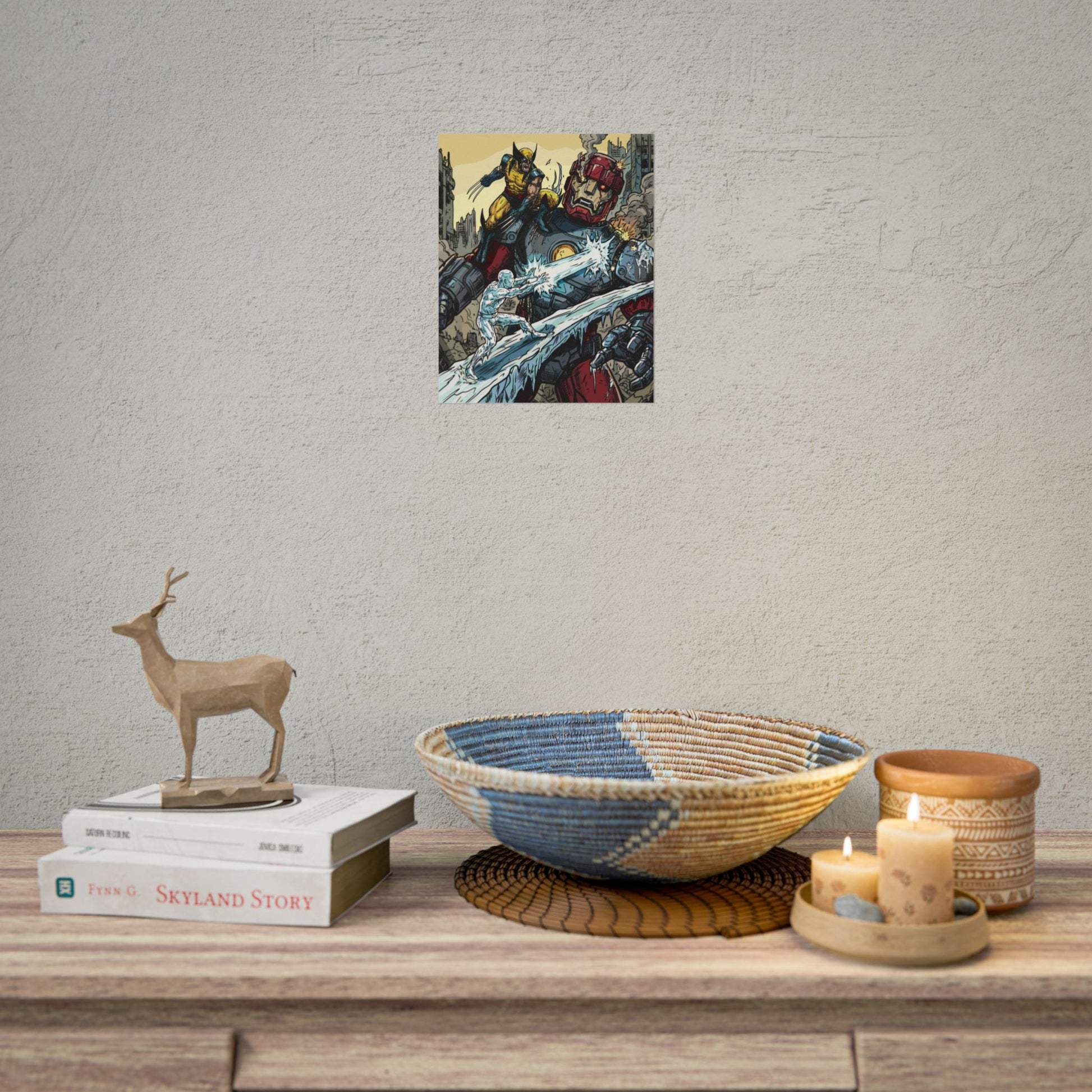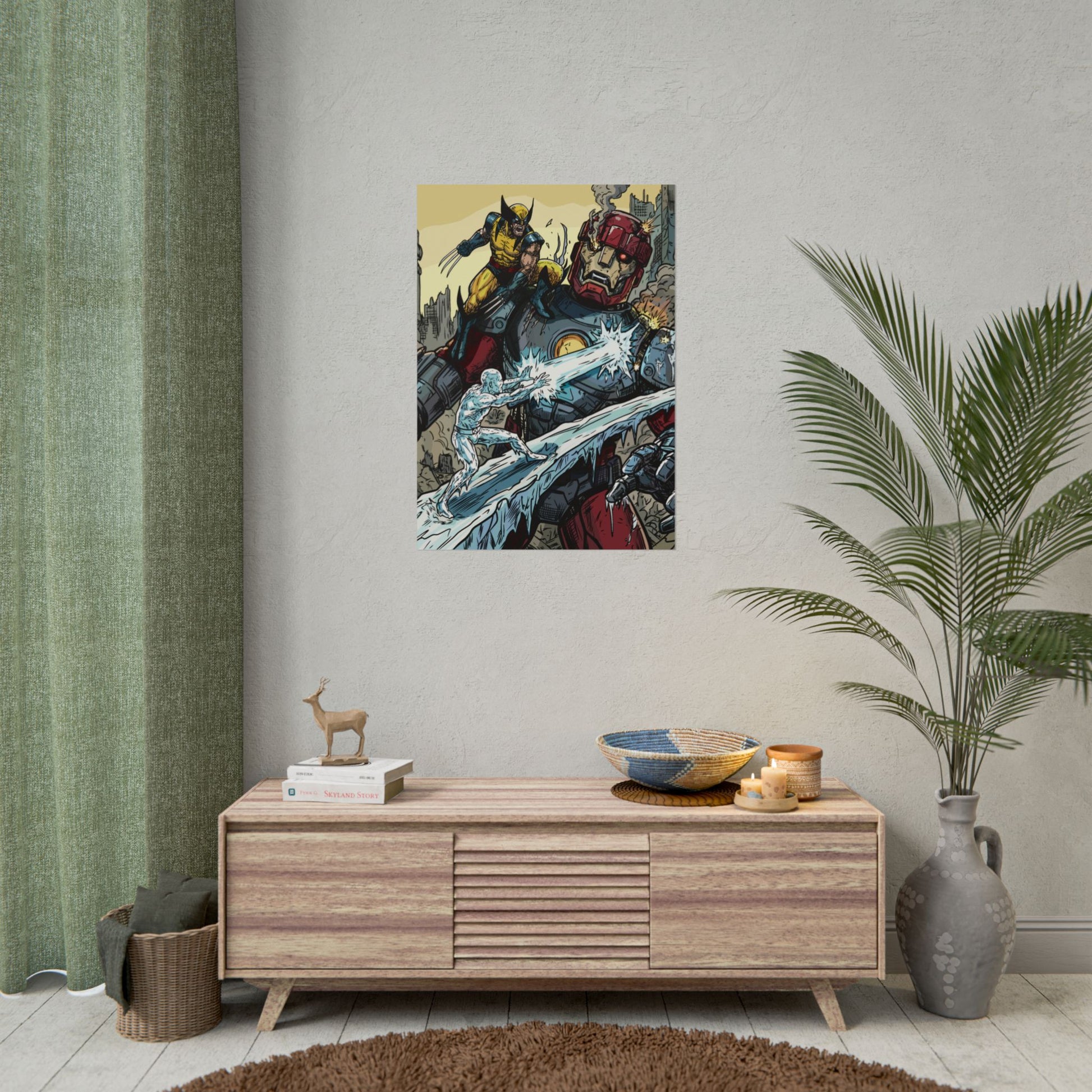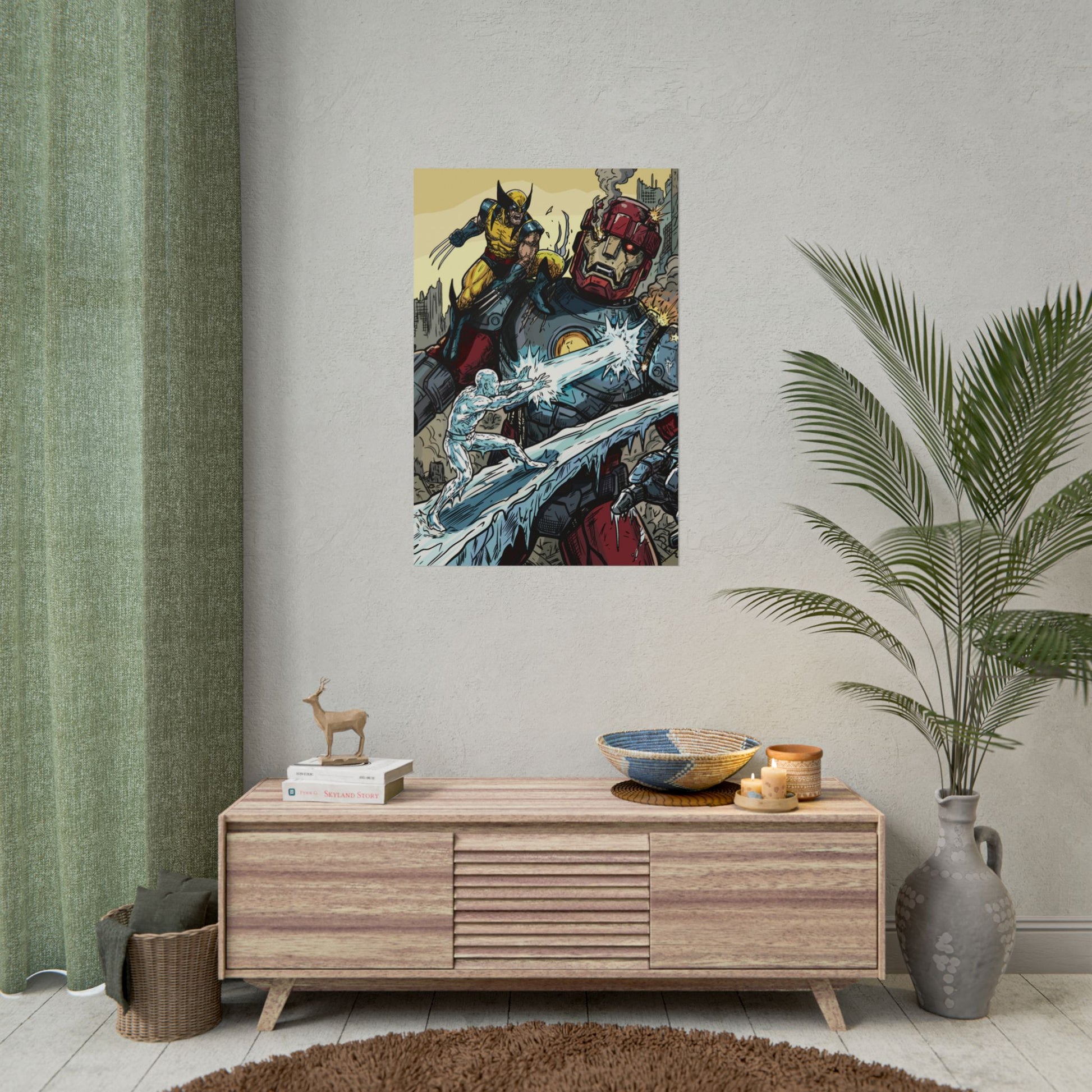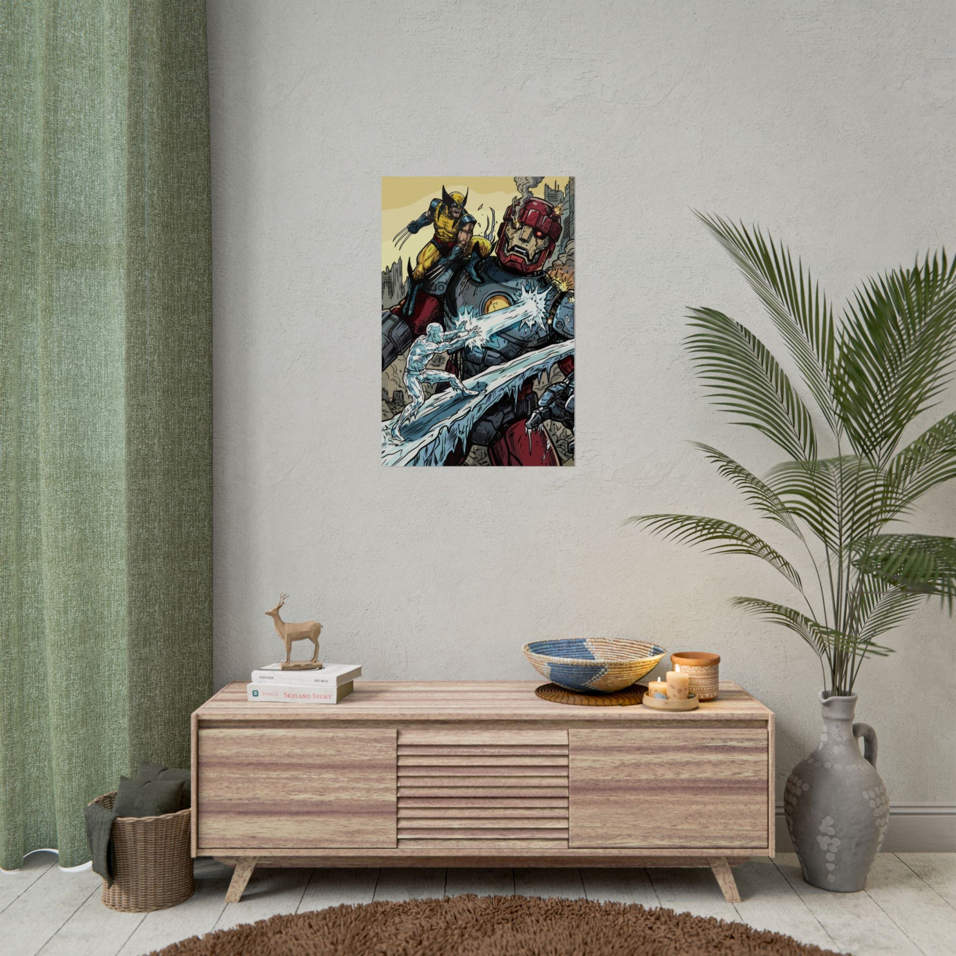 A bold, high-impact poster that brings comic-book energy to any wall. The artwork crackles with motion — a fierce hero leaping across a fractured cityscape while icy powers collide with a towering armored giant. Printed with rich giclée color on your choice of textured fine art, semi-glossy photo, or understated matte paper, each print holds vivid detail and strong contrast that make every line and splash of color pop. Rolled for safe shipping, this poster arrives ready to frame or clip and hang, adding an instant focal point to a studio, den, or fan wall.