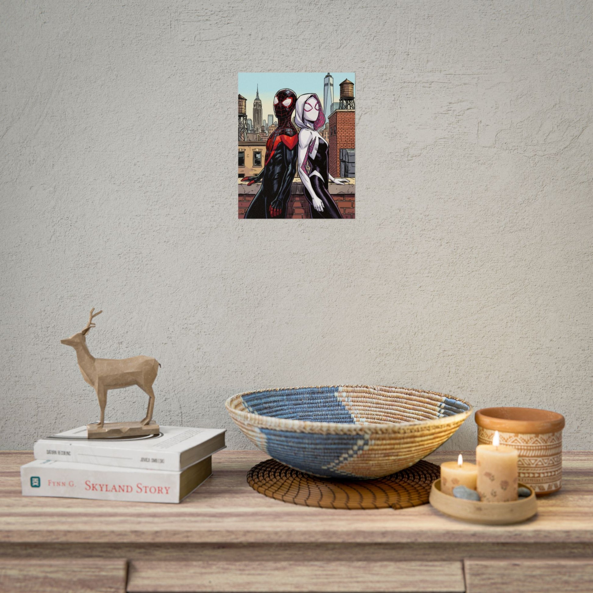 This poster speaks to fans who grew up on city rooftops, comic-issue covers, and fast-paced hero stories. It brings a sense of rooftop quiet after the chase — a shared, steady calm when the city hums below. Hang it where you work, read, or game to keep that skyline energy close.