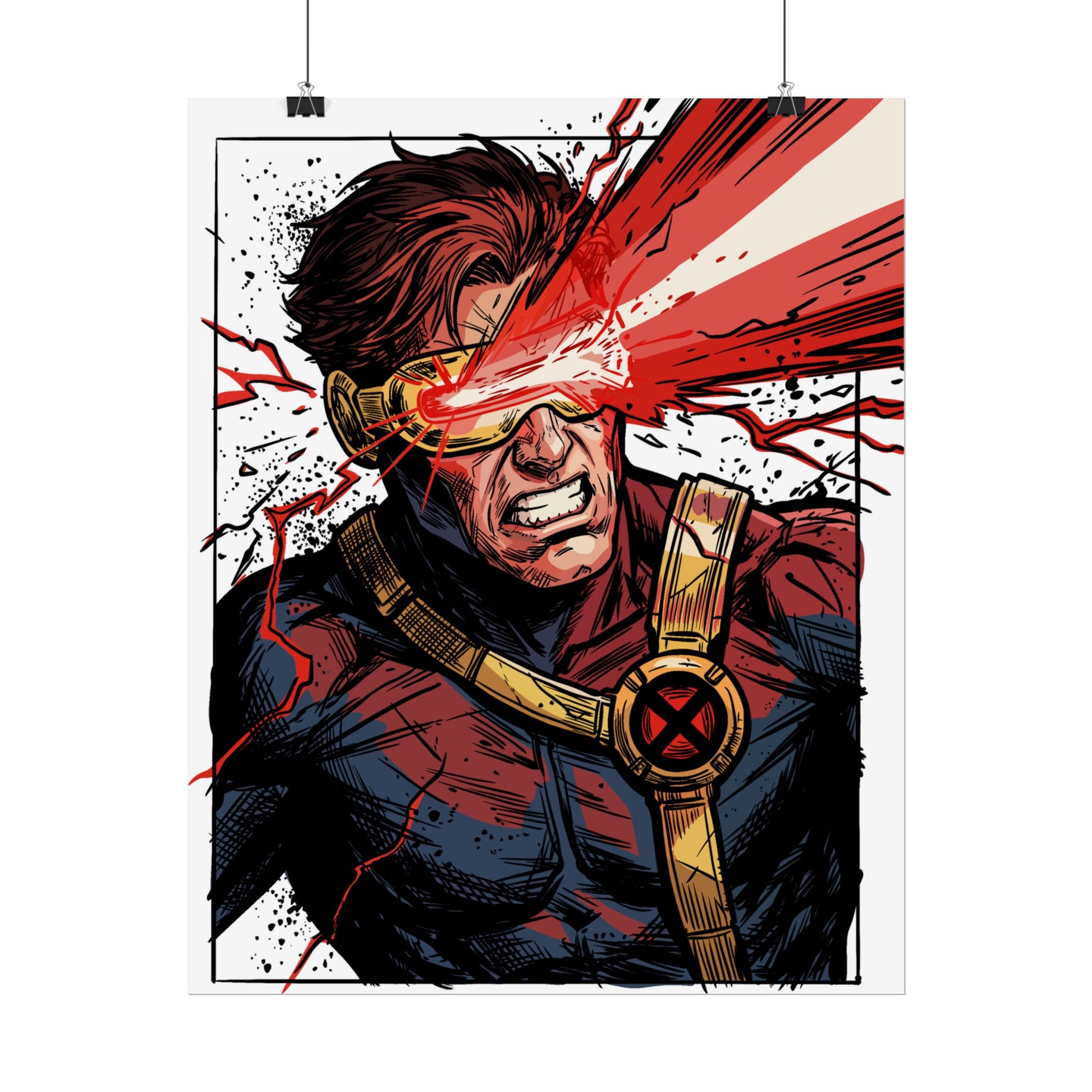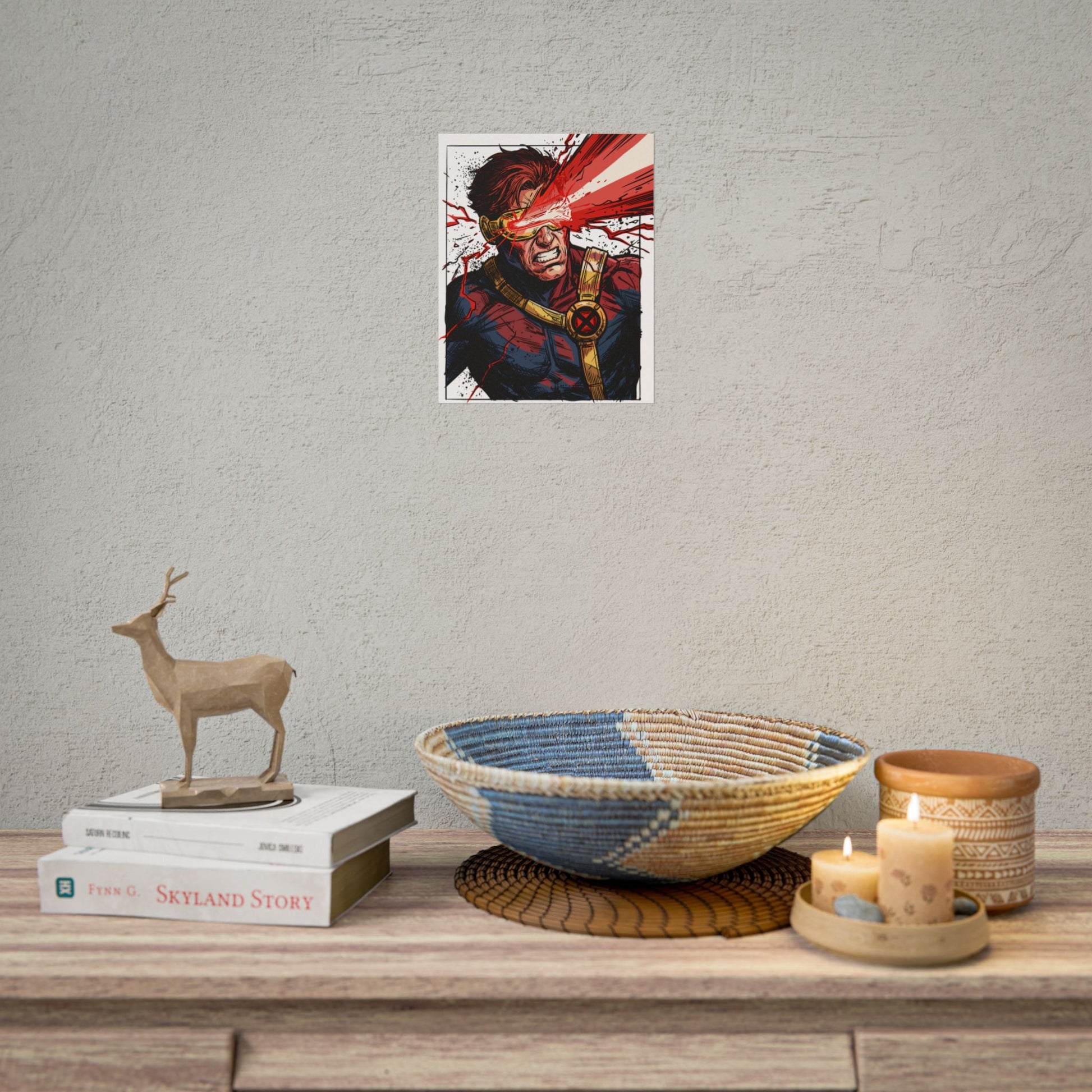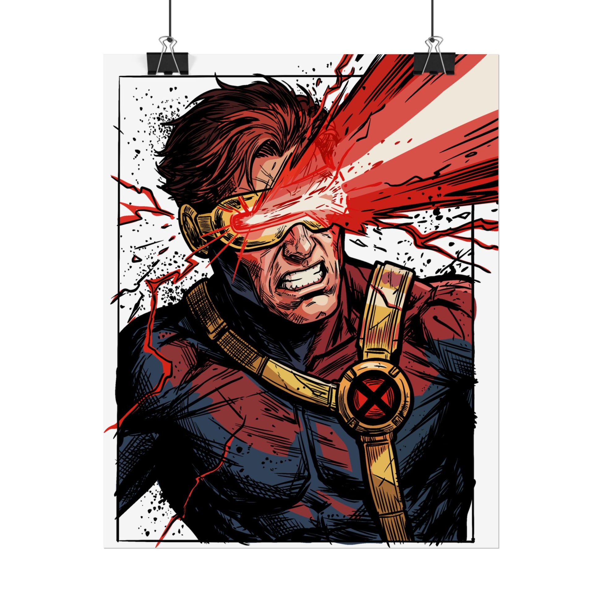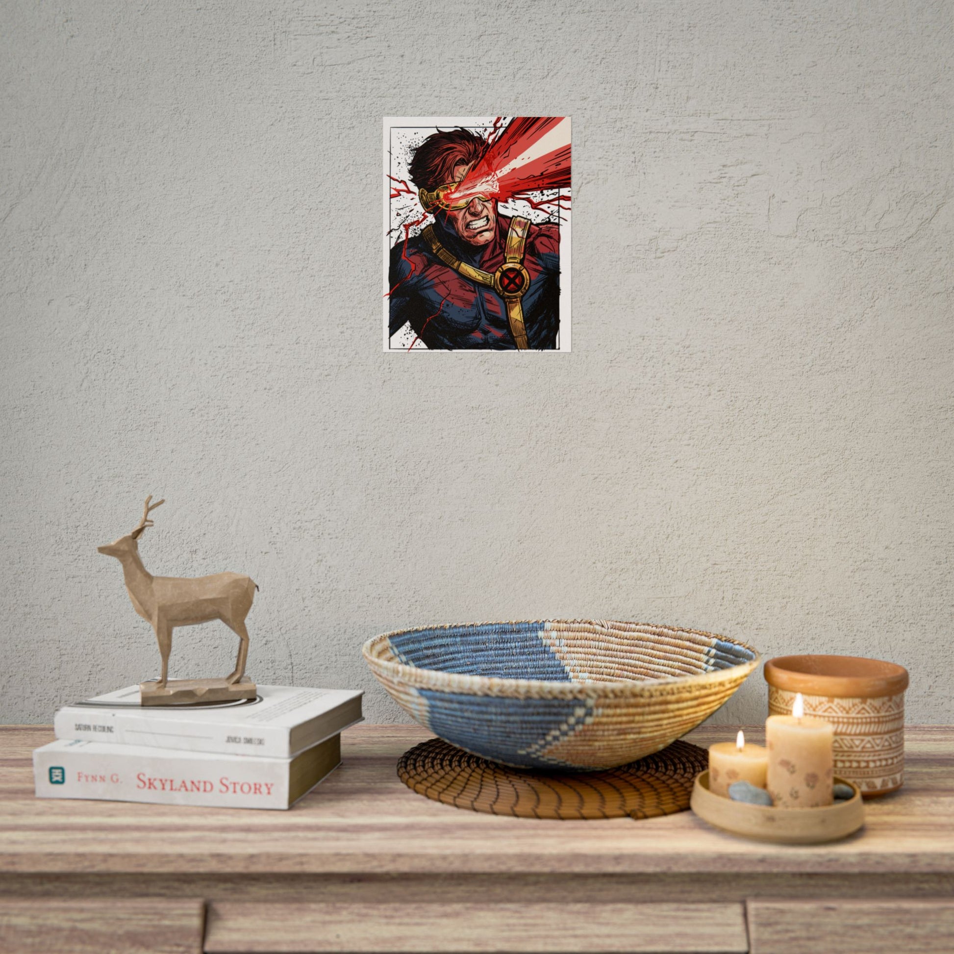 This rolled poster brings kinetic comic-book energy straight to your wall. Intense reds and inky blacks pop on your choice of archival fine art, satin semi-gloss, or muted matte paper — each option keeping linework crisp and colors vivid. Hang it in a studio, dorm, or living room to cut through the ordinary and make a bold visual statement. The image crackles with motion: clenched jaw, blazing optic blast, and paint-splatter accents that read like a panel ripped from a high-stakes issue. It fits into a collector’s shelf or a fan’s gallery wall, ready to be trimmed, framed, or displayed as-is once unrolled.