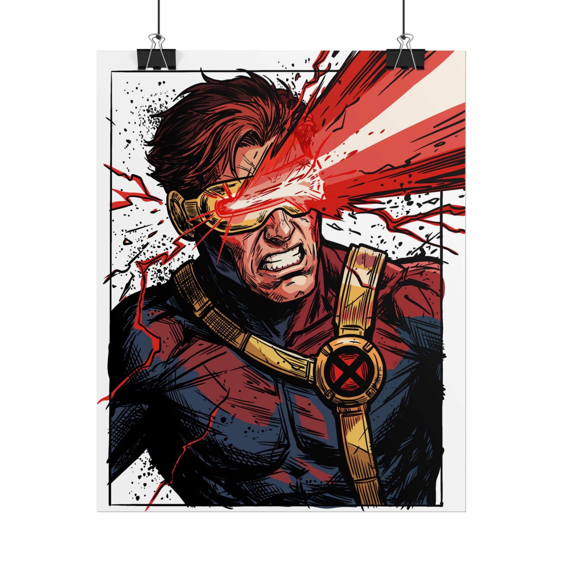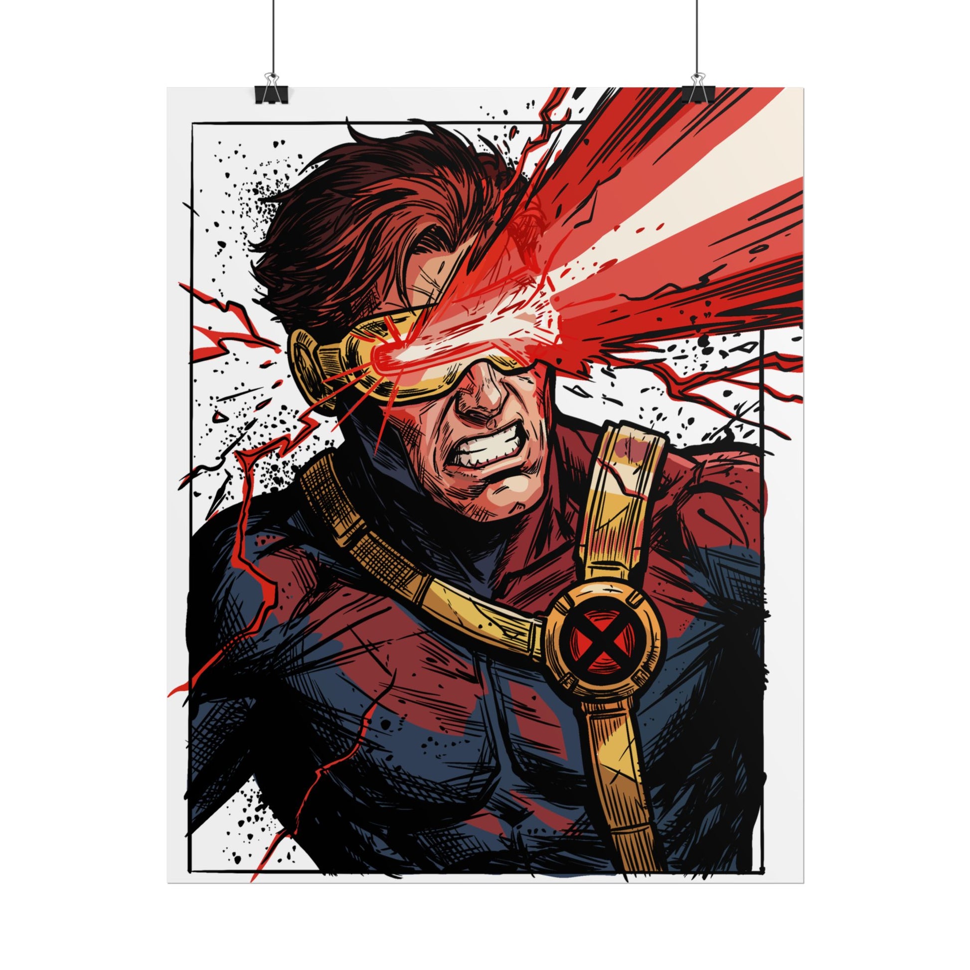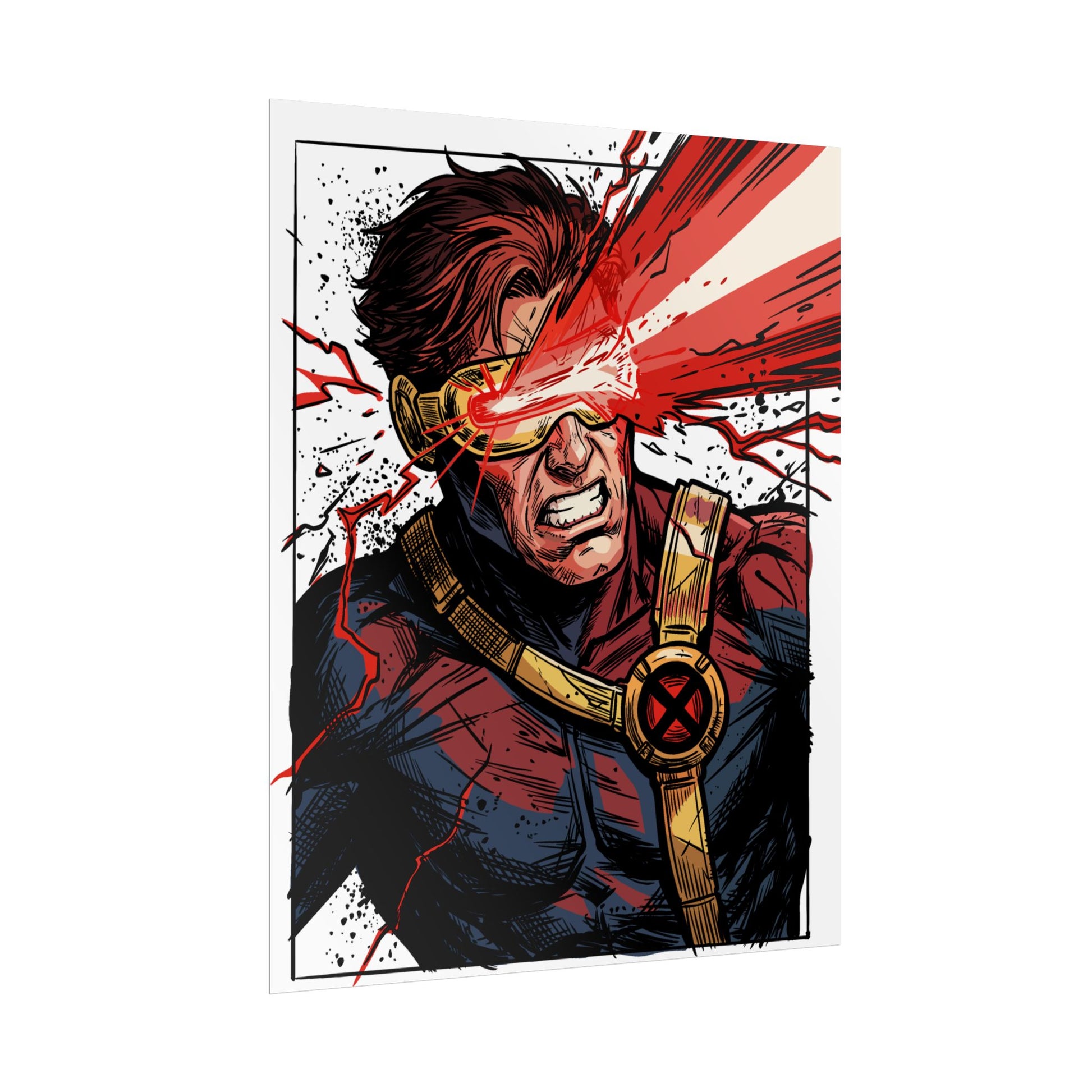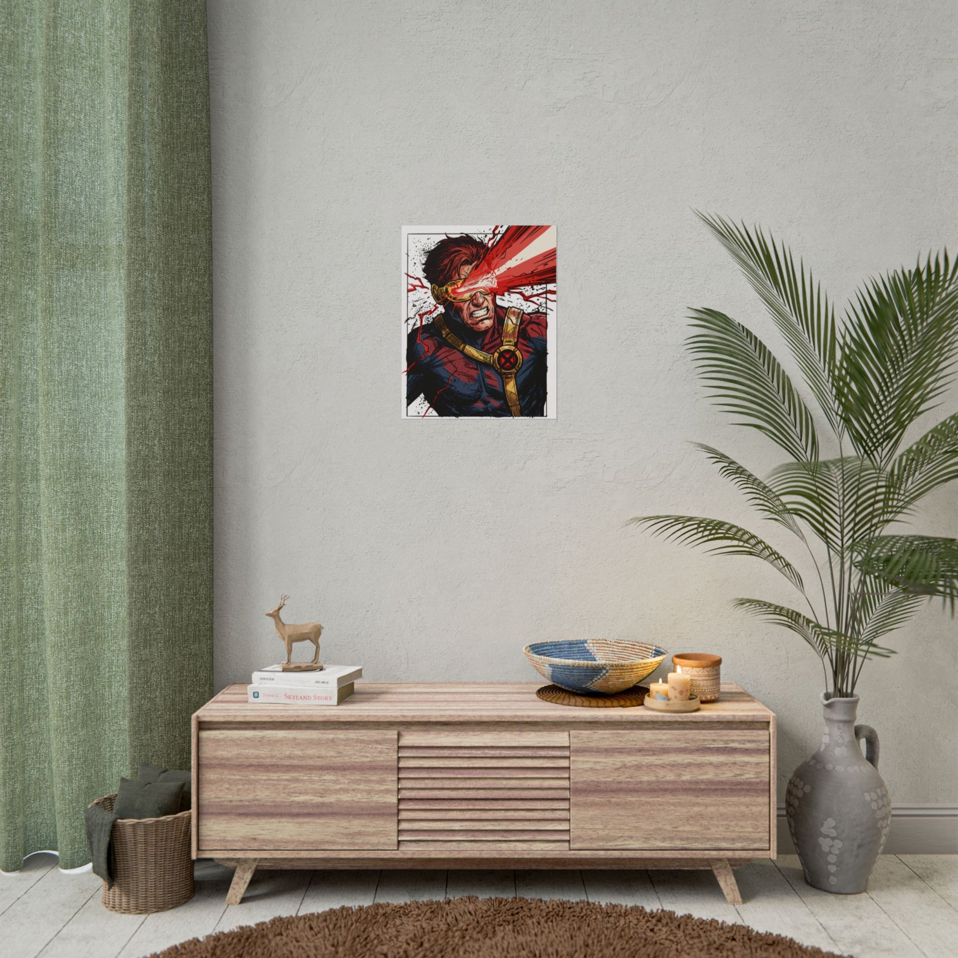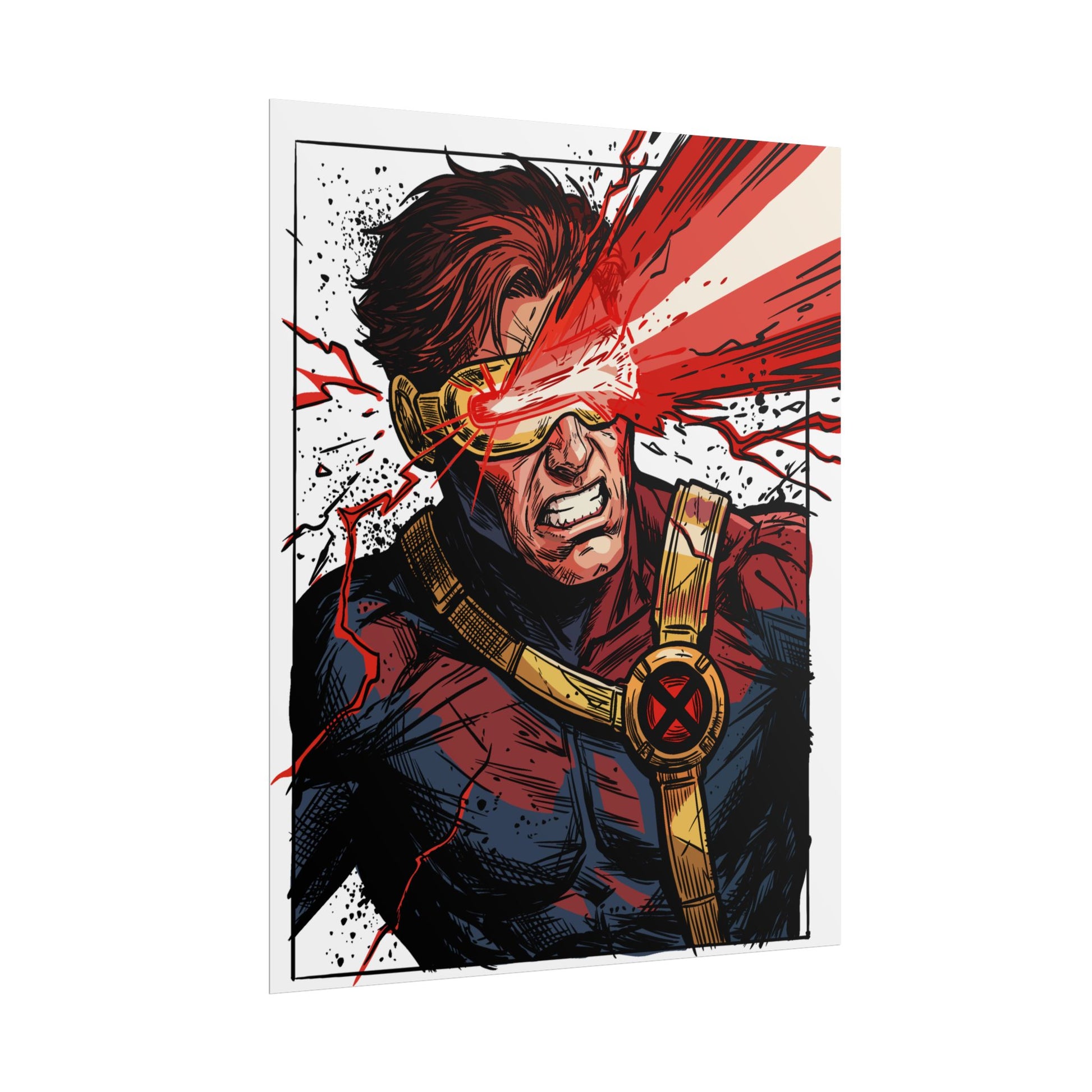 This rolled poster brings kinetic comic-book energy straight to your wall. Intense reds and inky blacks pop on your choice of archival fine art, satin semi-gloss, or muted matte paper — each option keeping linework crisp and colors vivid. Hang it in a studio, dorm, or living room to cut through the ordinary and make a bold visual statement. The image crackles with motion: clenched jaw, blazing optic blast, and paint-splatter accents that read like a panel ripped from a high-stakes issue. It fits into a collector’s shelf or a fan’s gallery wall, ready to be trimmed, framed, or displayed as-is once unrolled.