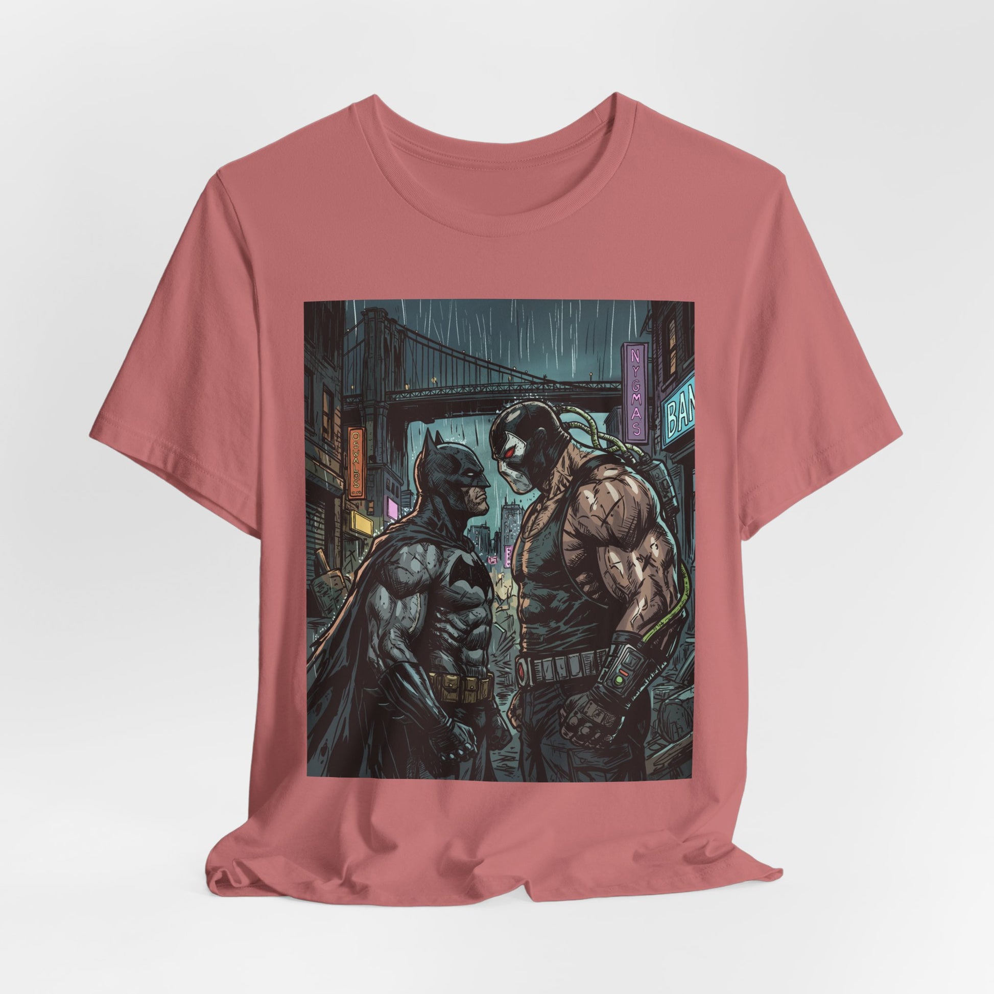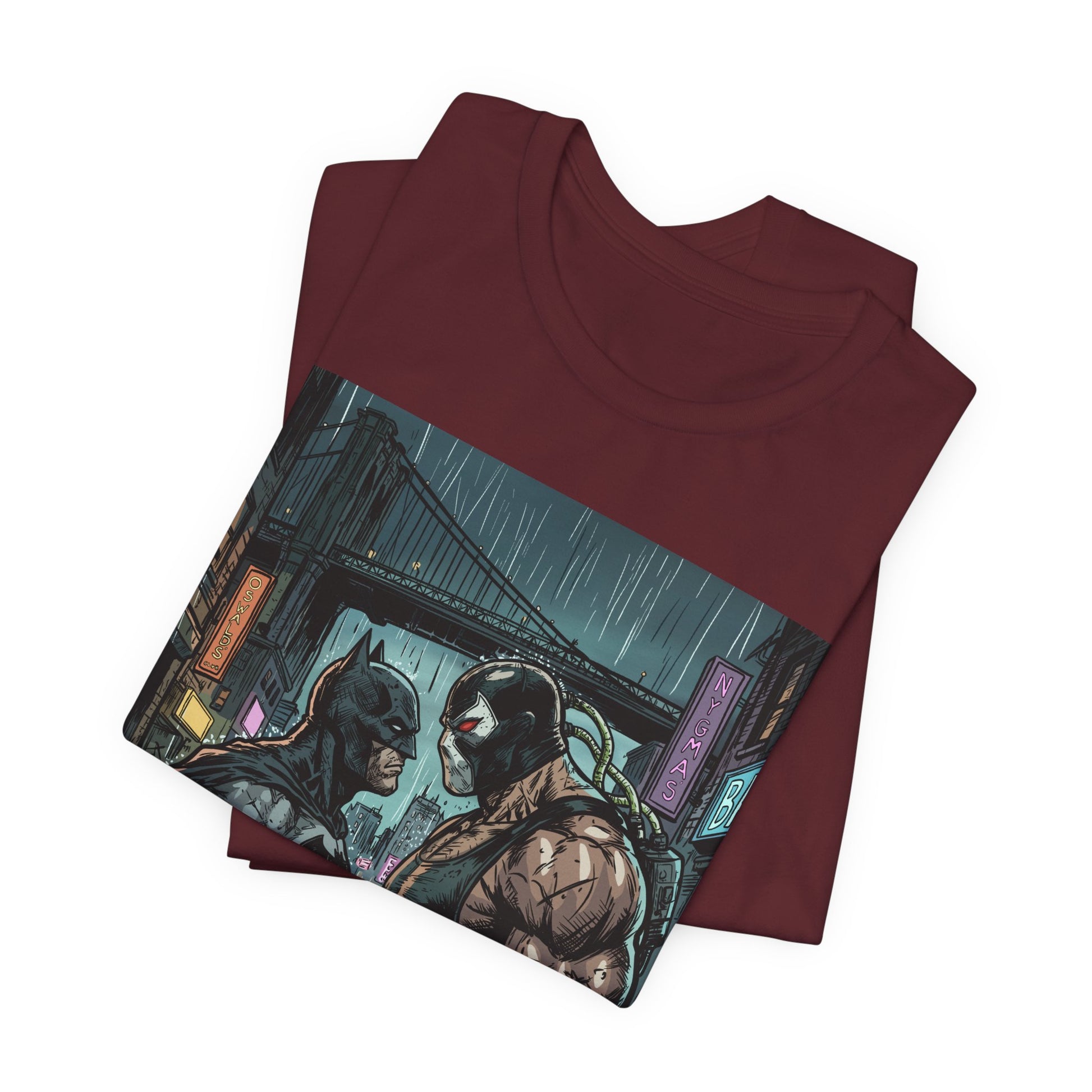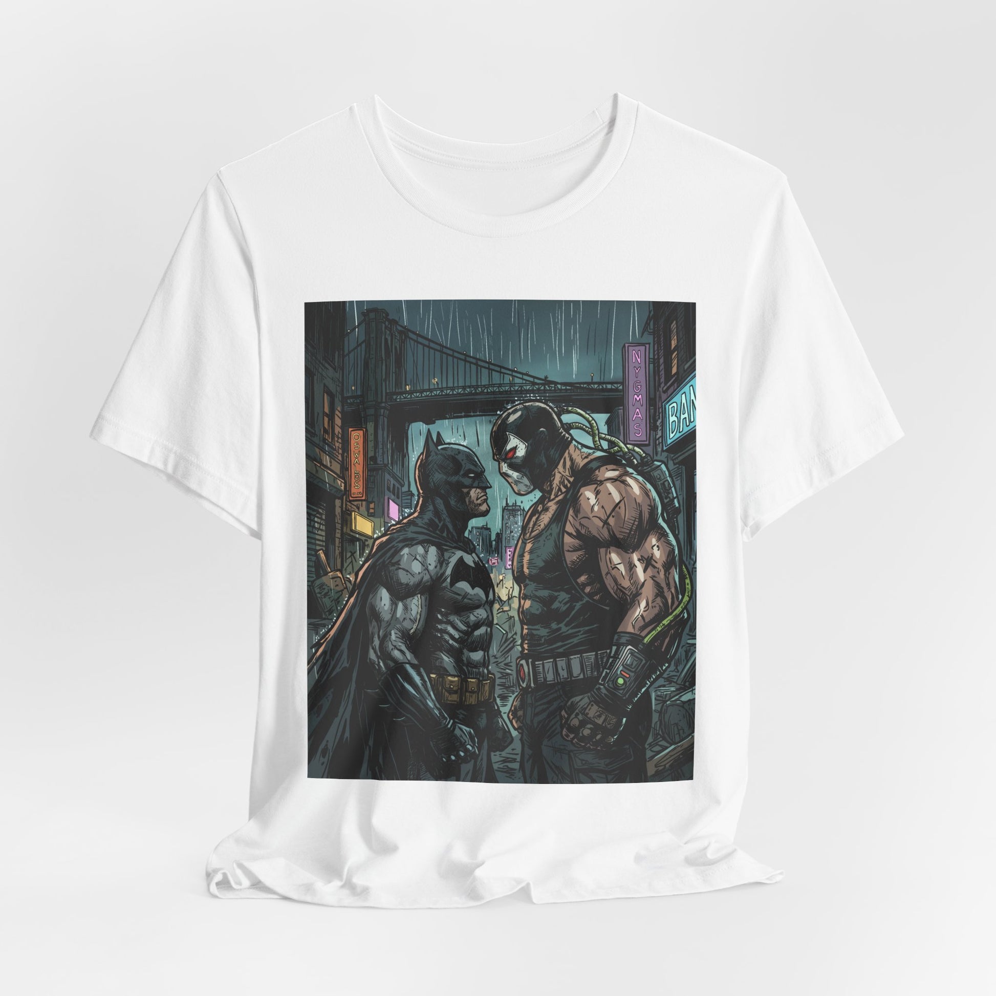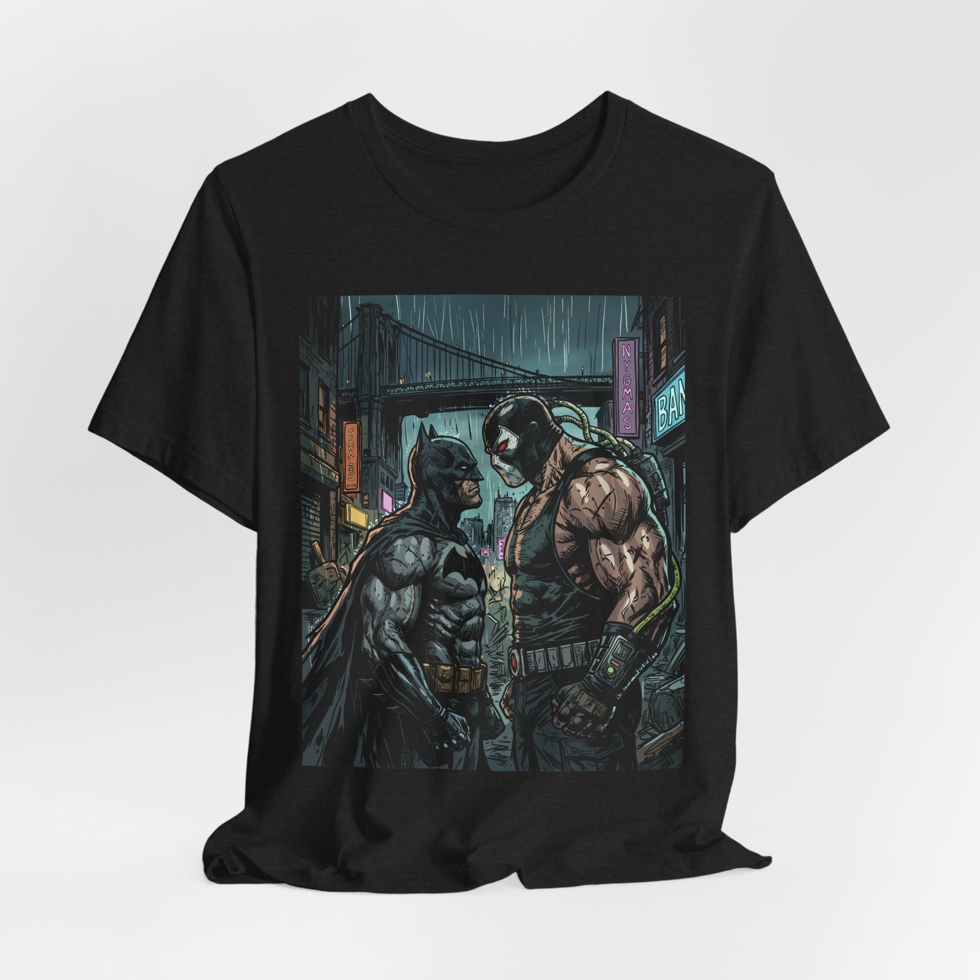 A boldly illustrated tee that brings comic-book intensity to your everyday rotation. This lightweight jersey shirt features a gritty, rain-soaked street scene of two armored figures facing off beneath neon lights — high-contrast inks and detailed linework give the image cinematic depth. The soft Airlume combed ring-spun cotton feels breathable against the skin and layers easily under jackets. Built with side seams, shoulder tape and a ribbed crew collar, it keeps its shape through wear. Wear it when you want to channel that raw, urban energy — to a late-night meet-up, a comic-panel launch, or just when the city feels like a story unfolding around you.