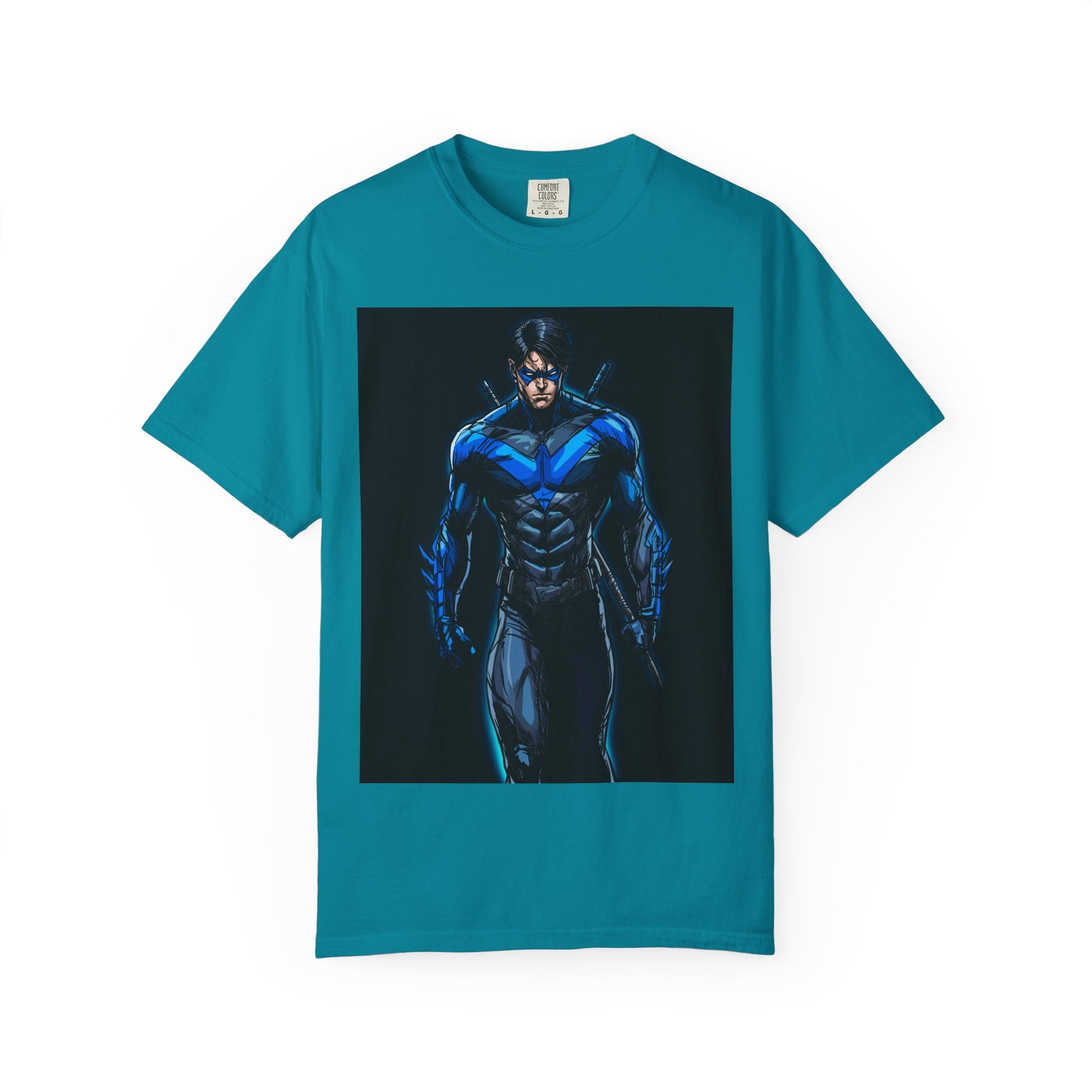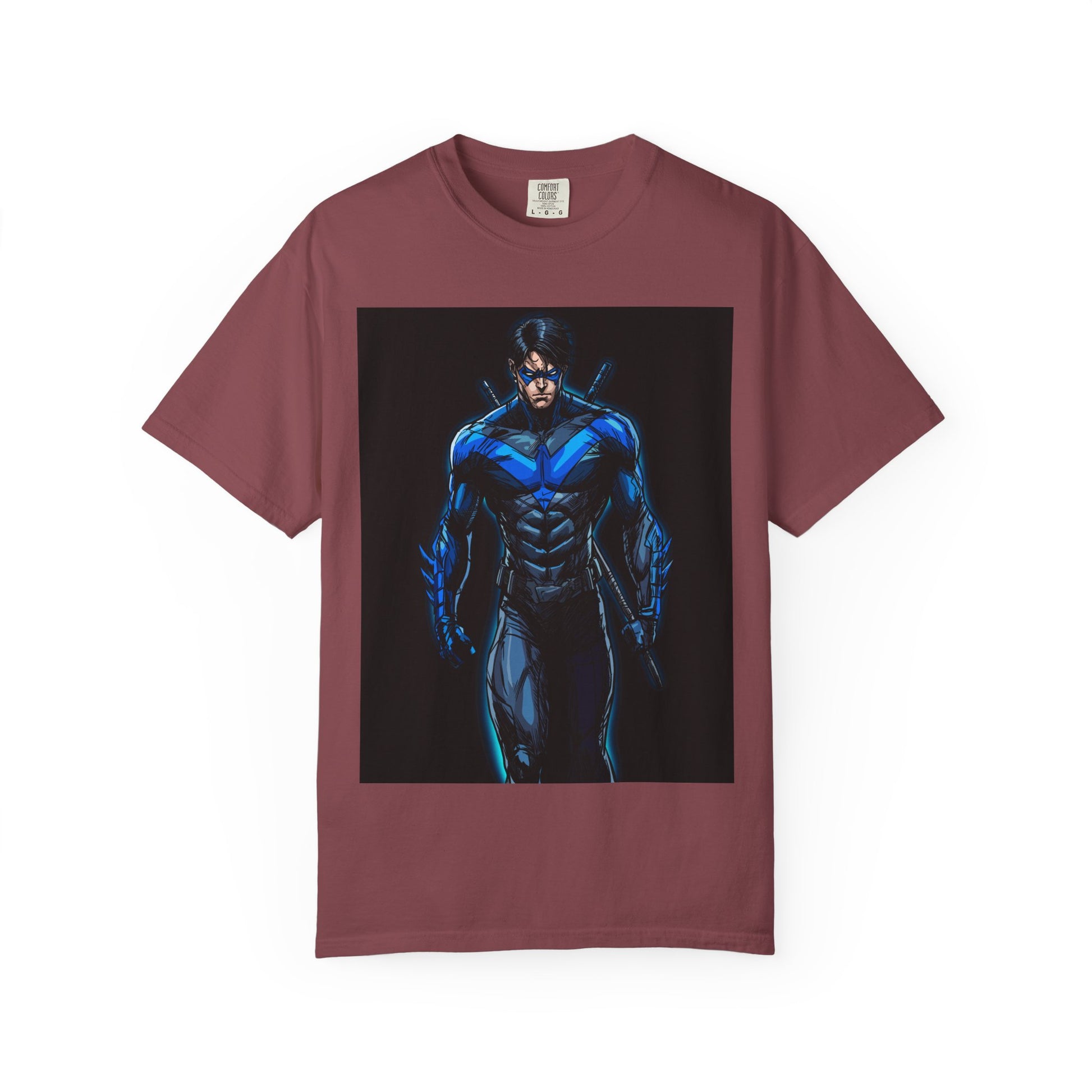 A heavyweight, garment-dyed tee with a bold printed superhero figure that reads like armor in deep blues and glossy blacks. The relaxed, tubular knit gives a clean silhouette while the soft, post-dye finish adds lived-in comfort and muted color depth. Wear it on weekend adventures or late-night comic runs — it layers easily under a jacket and holds shape thanks to double-needle stitching. This shirt feels like your go-to piece when you want something sturdy, comfortable, and visually striking without shouting for attention.