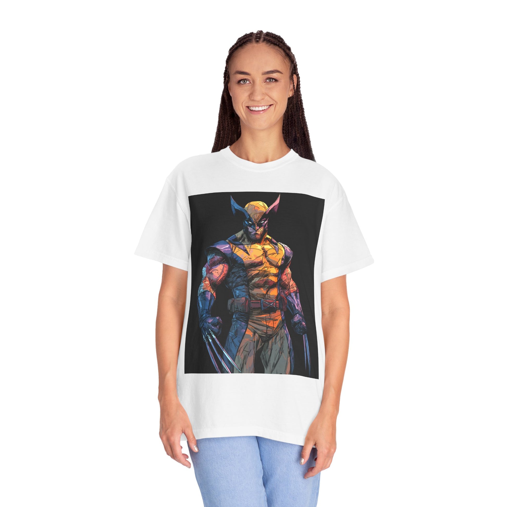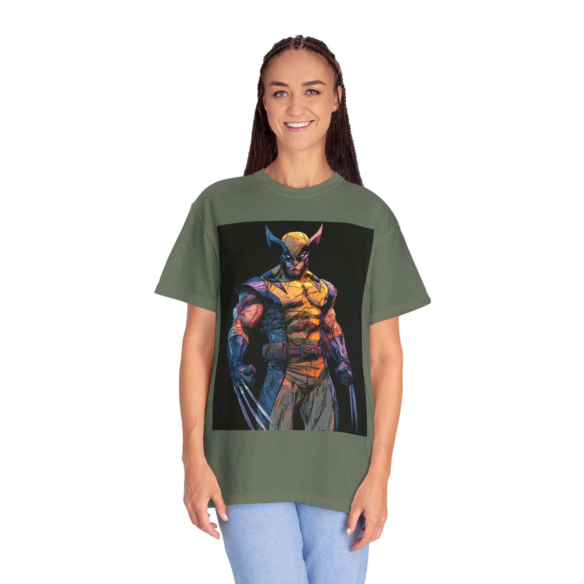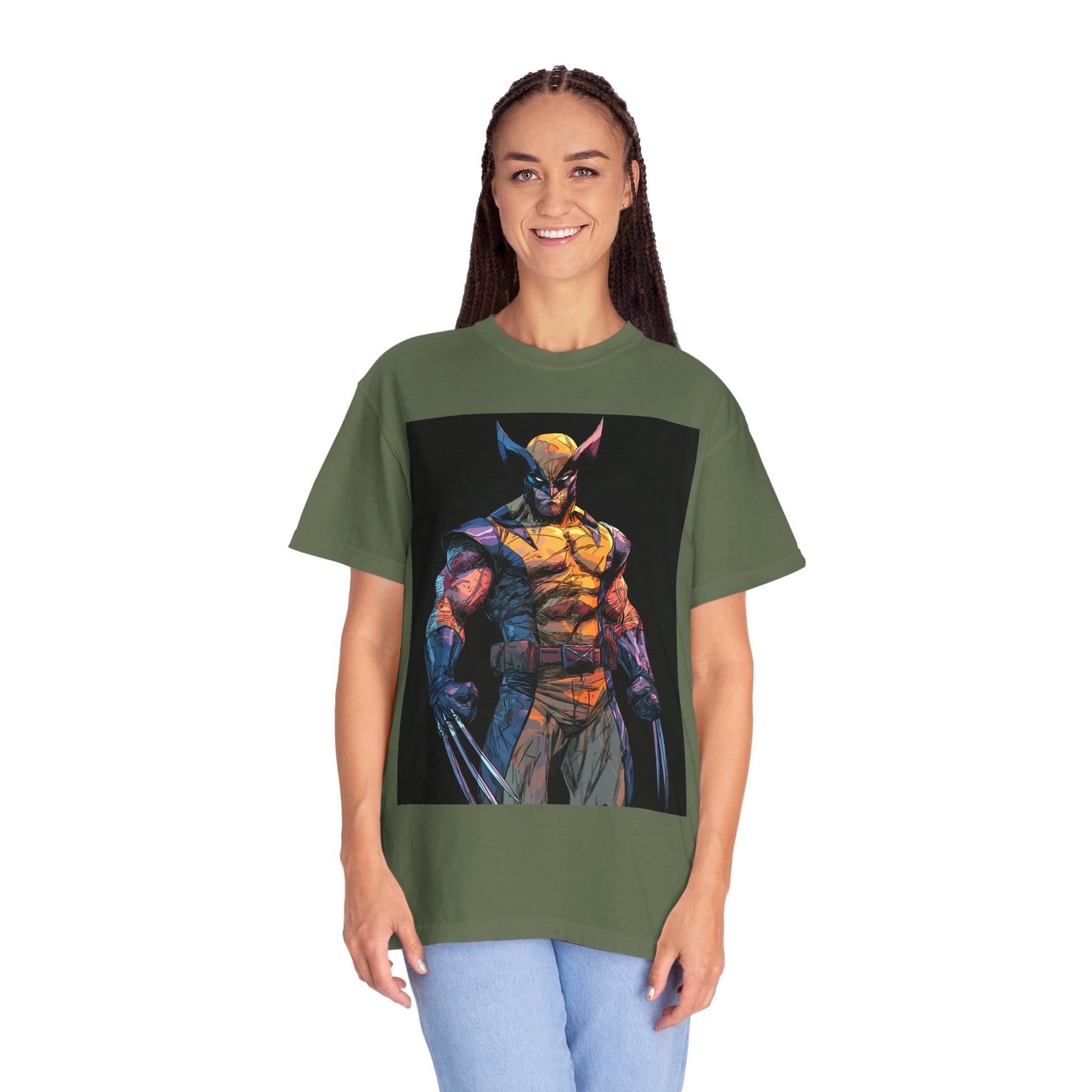 A soft, garment-dyed cotton tee that carries bold, comic-inspired energy. The relaxed fit drapes easily over layers while the medium-weight fabric keeps the shirt structured but comfortable. Colors are deep and lived-in thanks to the after-dye process, which also gives the surface a slightly vintage texture that complements the vibrant, painterly character artwork. Double-needle stitching and tubular knit construction make this shirt feel sturdy — it wears in, not out. Wear it to the next con, sketch session, or weekend hangout to show a fierce, art-forward side without shouting for attention.