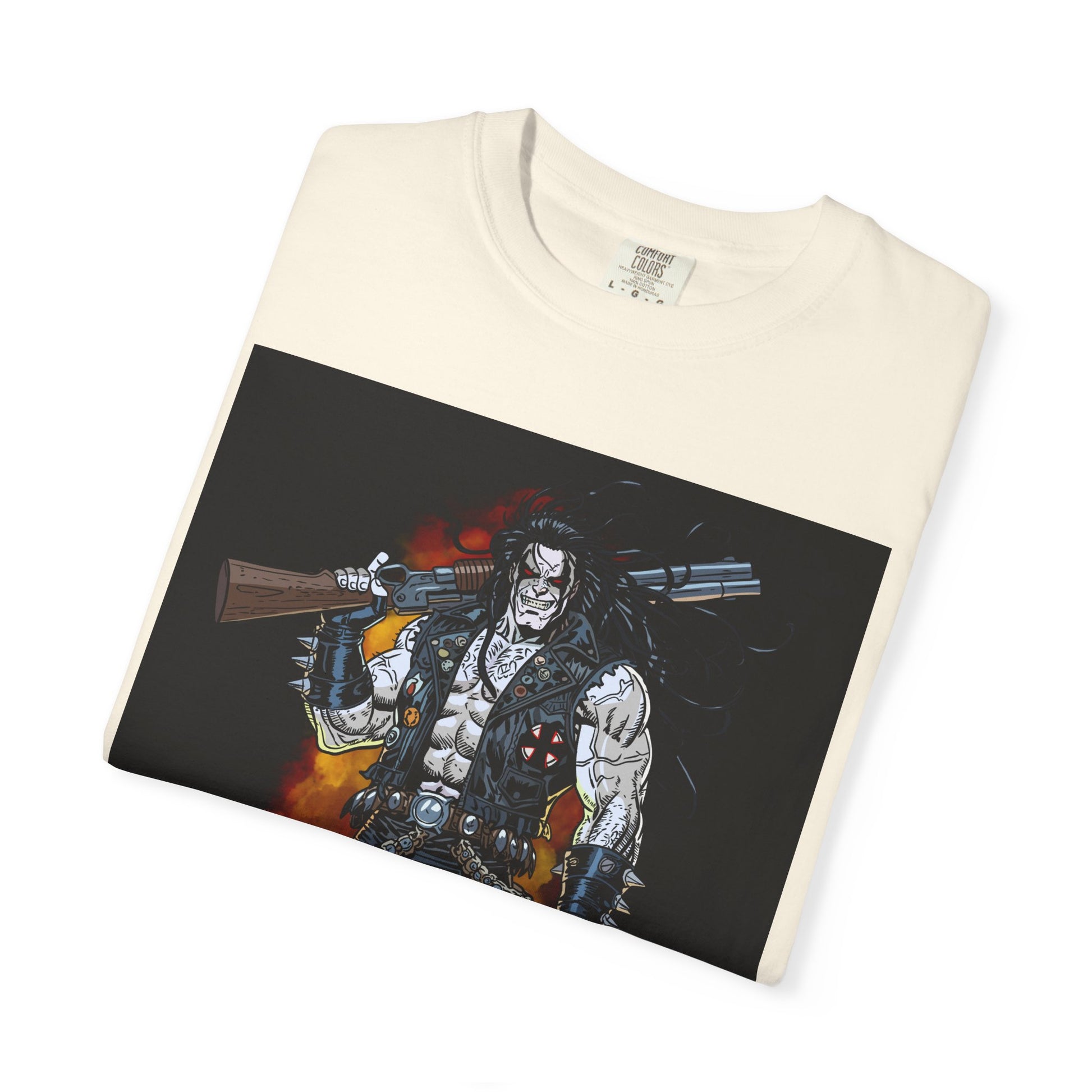 A heavyweight, garment-dyed cotton tee printed with a bold, graphic warrior illustration set against roaring flames. The relaxed-fit silhouette drapes easily over layers or stands alone as a statement piece. The image feels raw and cinematic — equal parts comic-book mercenary and outlaw — so it lands well for someone who leans into darker, edgy style. Soft, pre-shrunk ring-spun cotton and garment-dye give the shirt a lived-in hand and muted color depth that complements the intense front art. Wear it to shows, late-night rides, or when you want an outfit that says you’re not here to blend in.