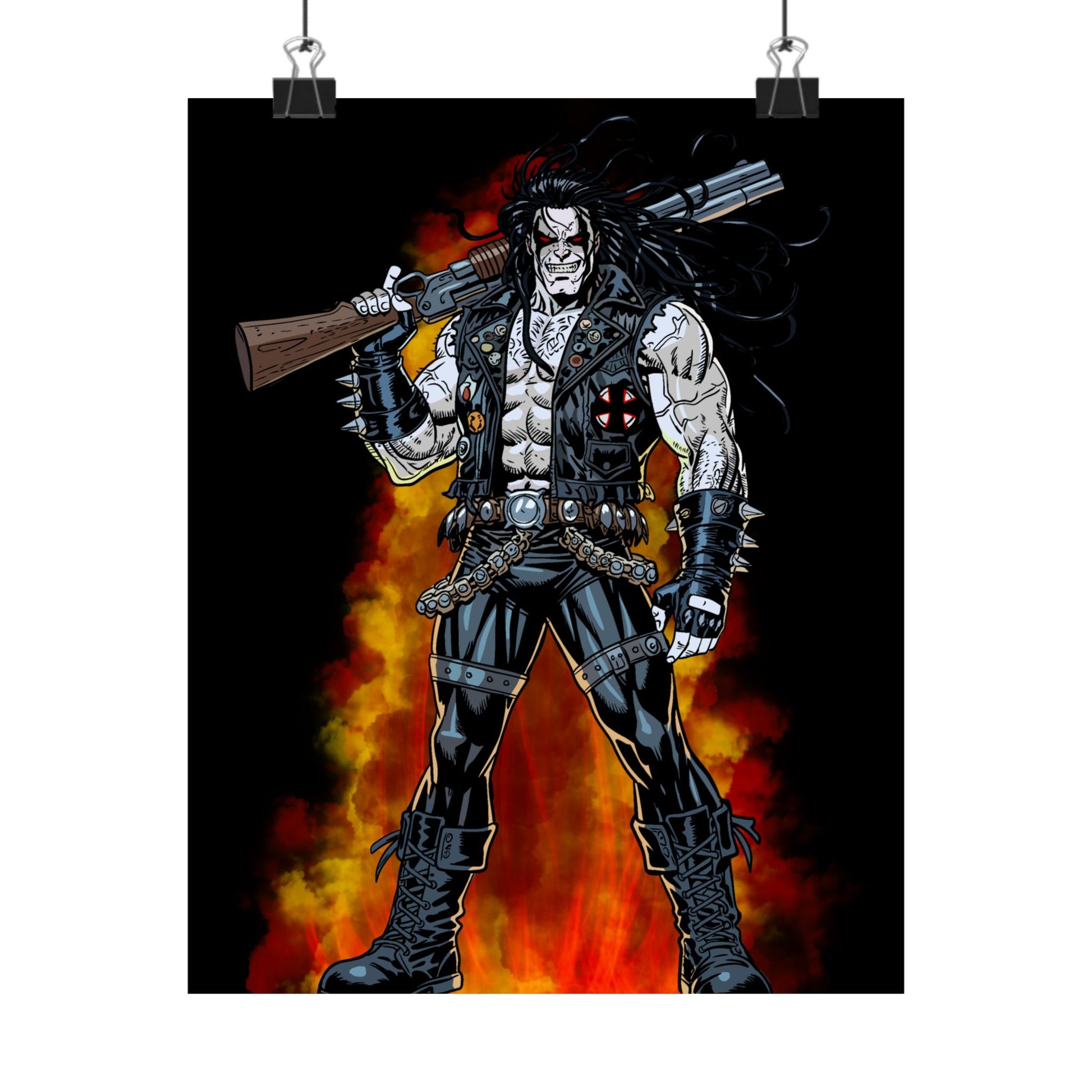 A bold matte poster that brings dark comic energy to any indoor wall. Printed with museum-grade archival paper and Giclée inks, the artwork holds intense blacks and fiery oranges without losing detail. The matte finish reduces glare, letting the grim, leather-clad antihero and the surrounding flames read crisp and dramatic under room lighting. Sized across many options, this poster works as a statement piece in a personal studio, game room, or collector’s gallery. Hang it solo or cluster with other genre art to heighten an intense, cinematic atmosphere.