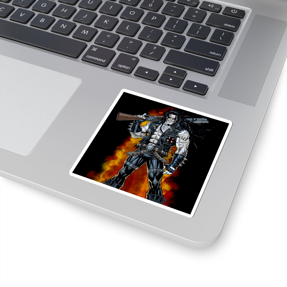 This glossy kiss-cut sticker channels raw, comic-book ferocity — a heavy-metal antihero standing against a backdrop of roaring flames. Printed on durable vinyl with vivid eco-solvent inks, the artwork’s deep blacks and fiery oranges pop with high contrast. Use it to mark your laptop, journal, or gear with a rebellious edge. The strong permanent adhesive keeps the sticker flat and smooth, while the glossy finish adds a sleek, resilient sheen that resists scratches. Available in white or transparent backs and multiple sizes to match your setup.
