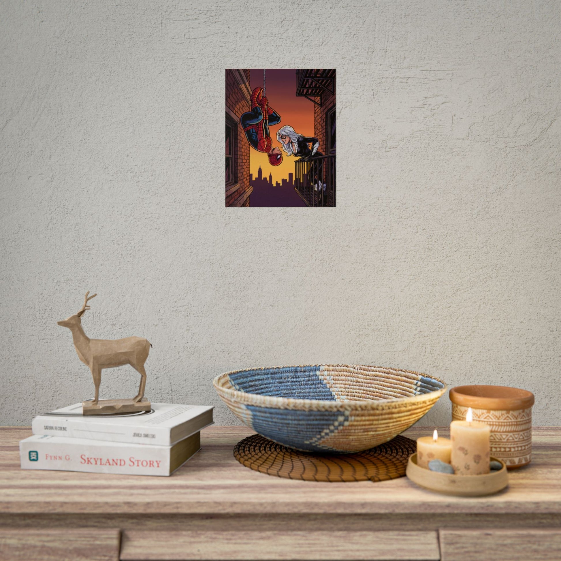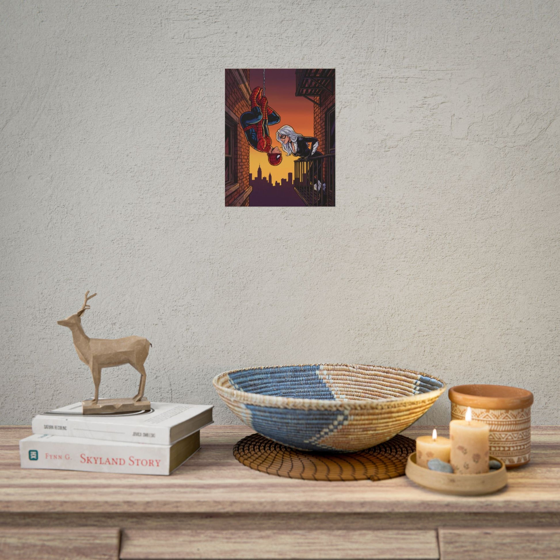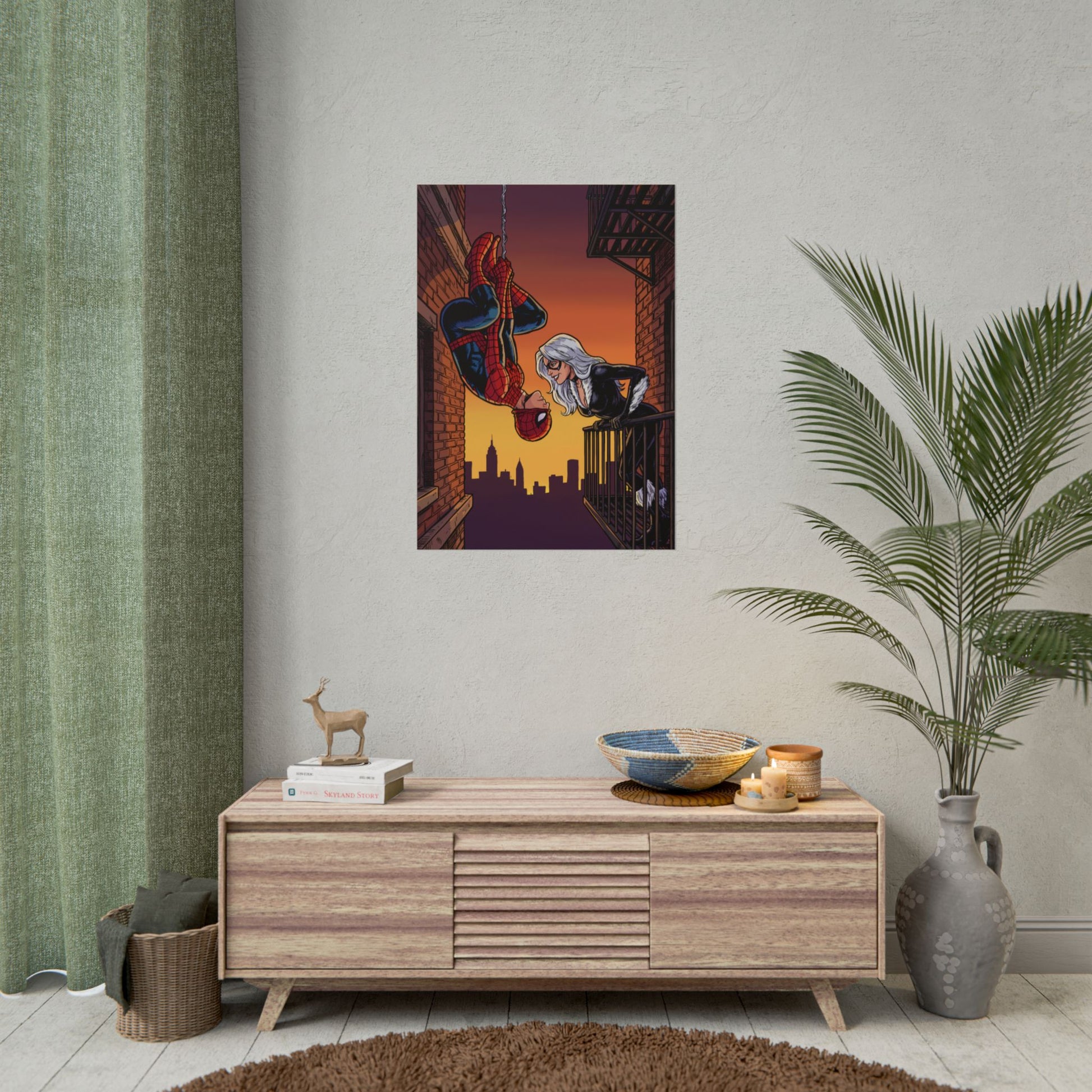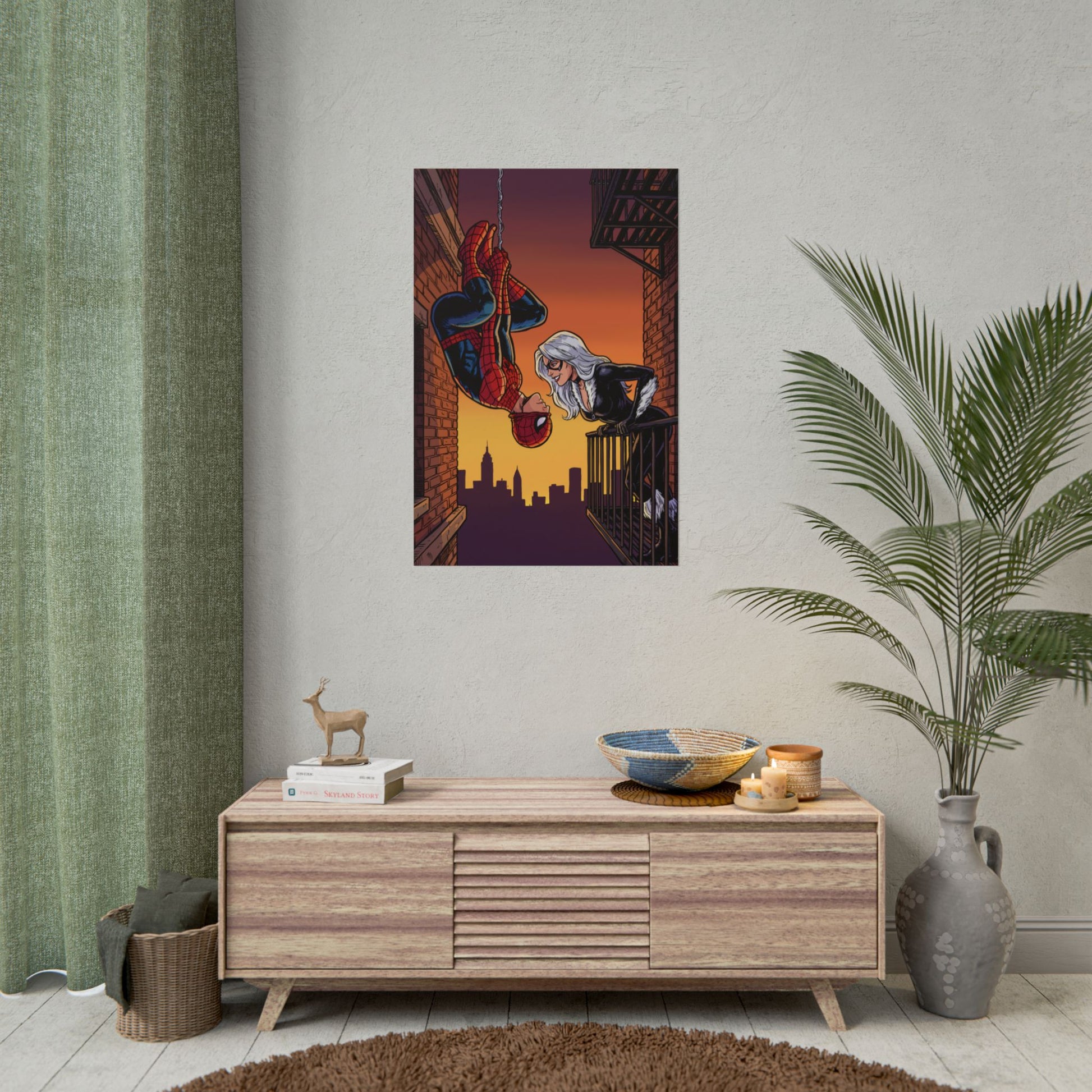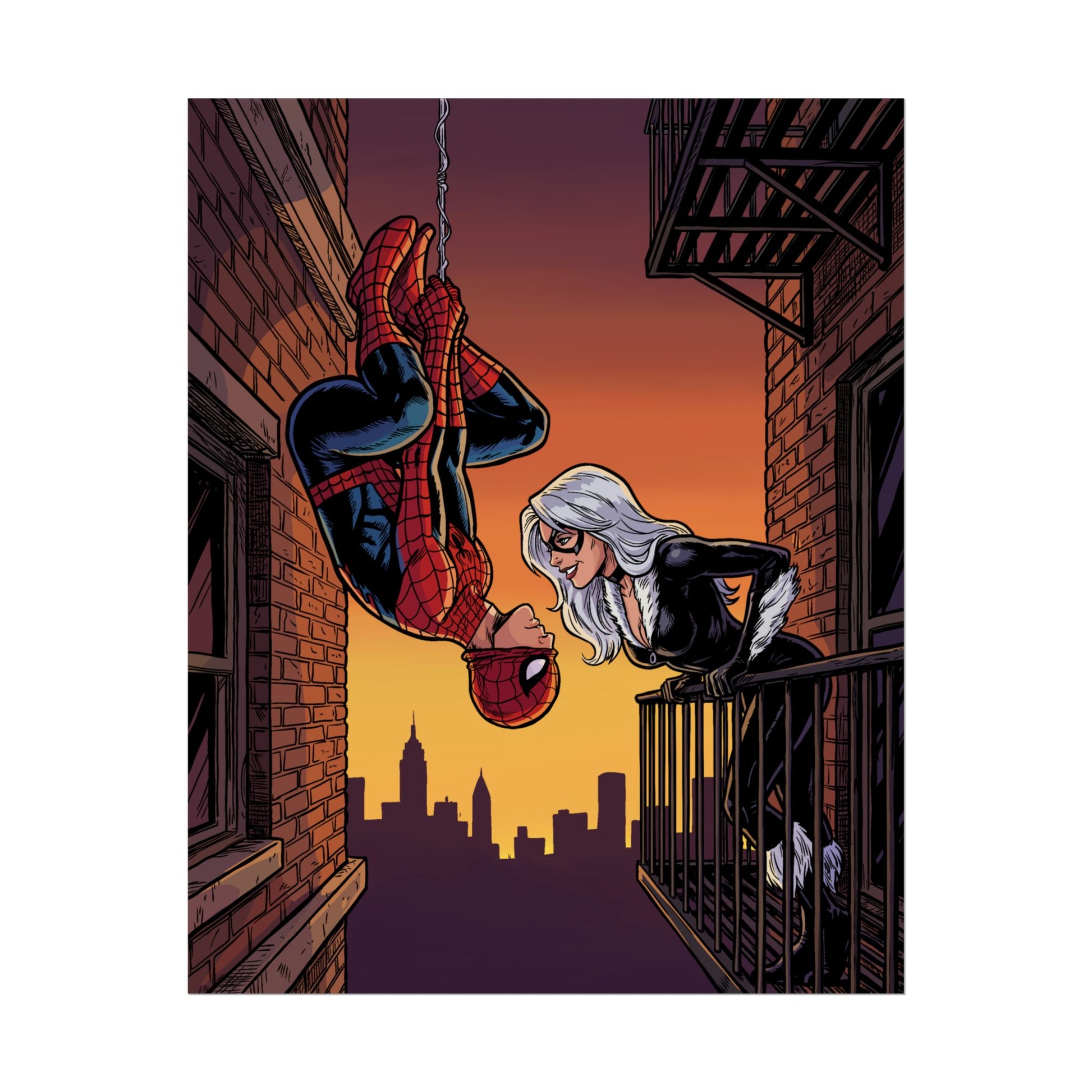 A rolled poster that brings comic-book romance and city-night drama into any room. The scene captures a rooftop moment at sunset — a web-slinger dangling upside-down from his line while a silver-haired figure leans from a fire escape, the skyline cut in warm purples and amber. Printed with vivid Giclée color or sharp photo finishes on your choice of fine art, semi-glossy, or matte paper, this artwork holds texture and depth whether you want painterly grain or crisp photographic fidelity. Rolled for safe shipping, it’s ready to frame or pin up in an office, studio, or bedroom where graphic storytelling and nostalgic superhero energy matter. The mood reads cinematic and intimate: dusk air, brickwork close enough to touch, and a quiet charge between two figures — a visual that fits walls curated by comic collectors, pop-culture decorators, and anyone who loves urban romance scenes.