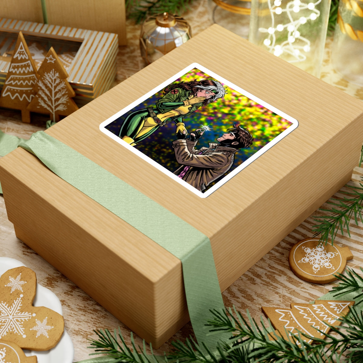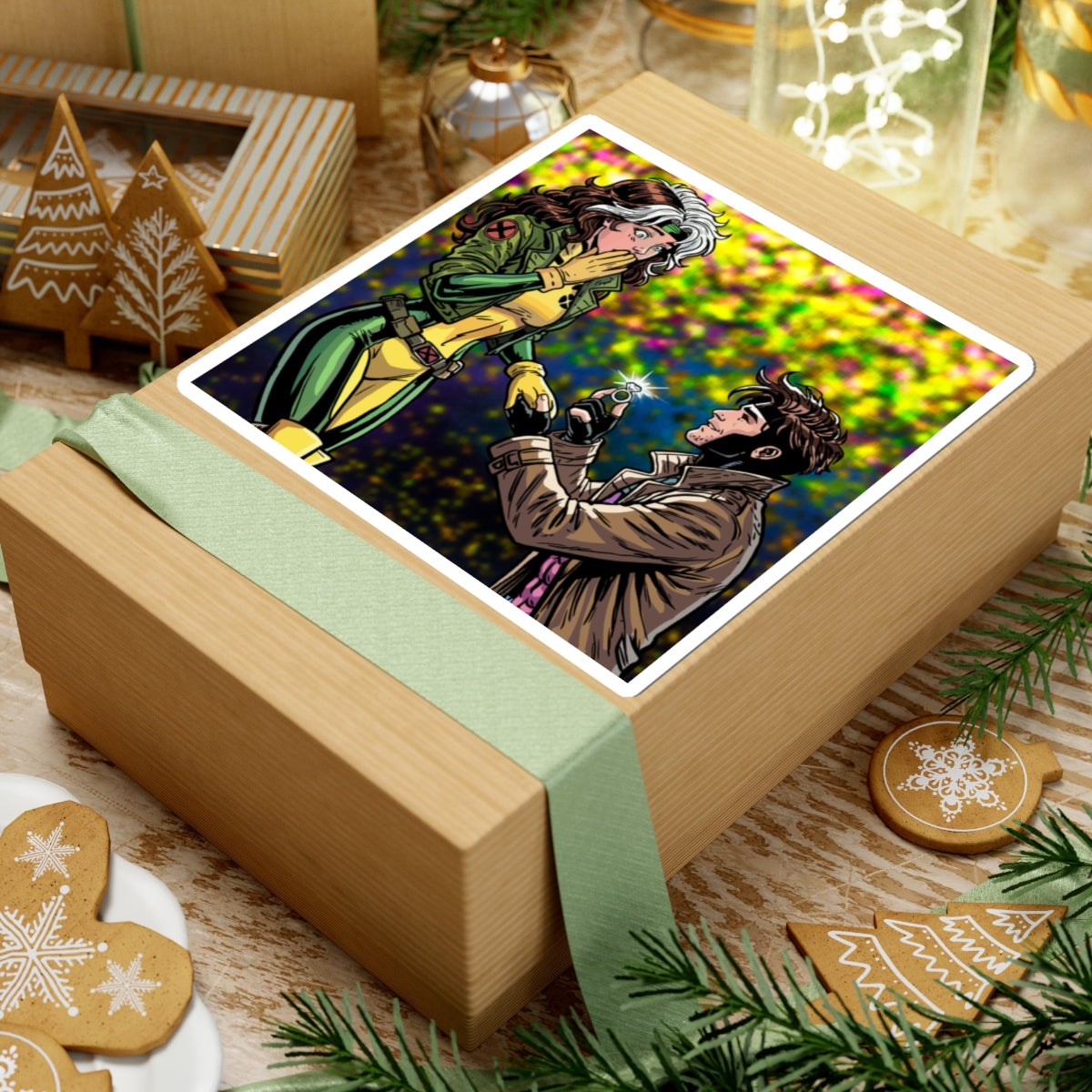 A glossy kiss-cut vinyl sticker that captures a tender, comic-book proposal scene between two beloved mutant heroes. The vibrant, eco-solvent printed colors pop against a multicolored bokeh background, highlighting the characters’ expressive faces and classic costumes. Durable vinyl with a permanent acrylic adhesive ensures this decal stays put on smooth, flat surfaces like laptops, journals, and water-resistant phone cases (note: sticker itself is not waterproof). Available in white or transparent backing and multiple sizes, it applies smoothly without bubbles and brings a touch of nostalgic romance to your everyday gear.