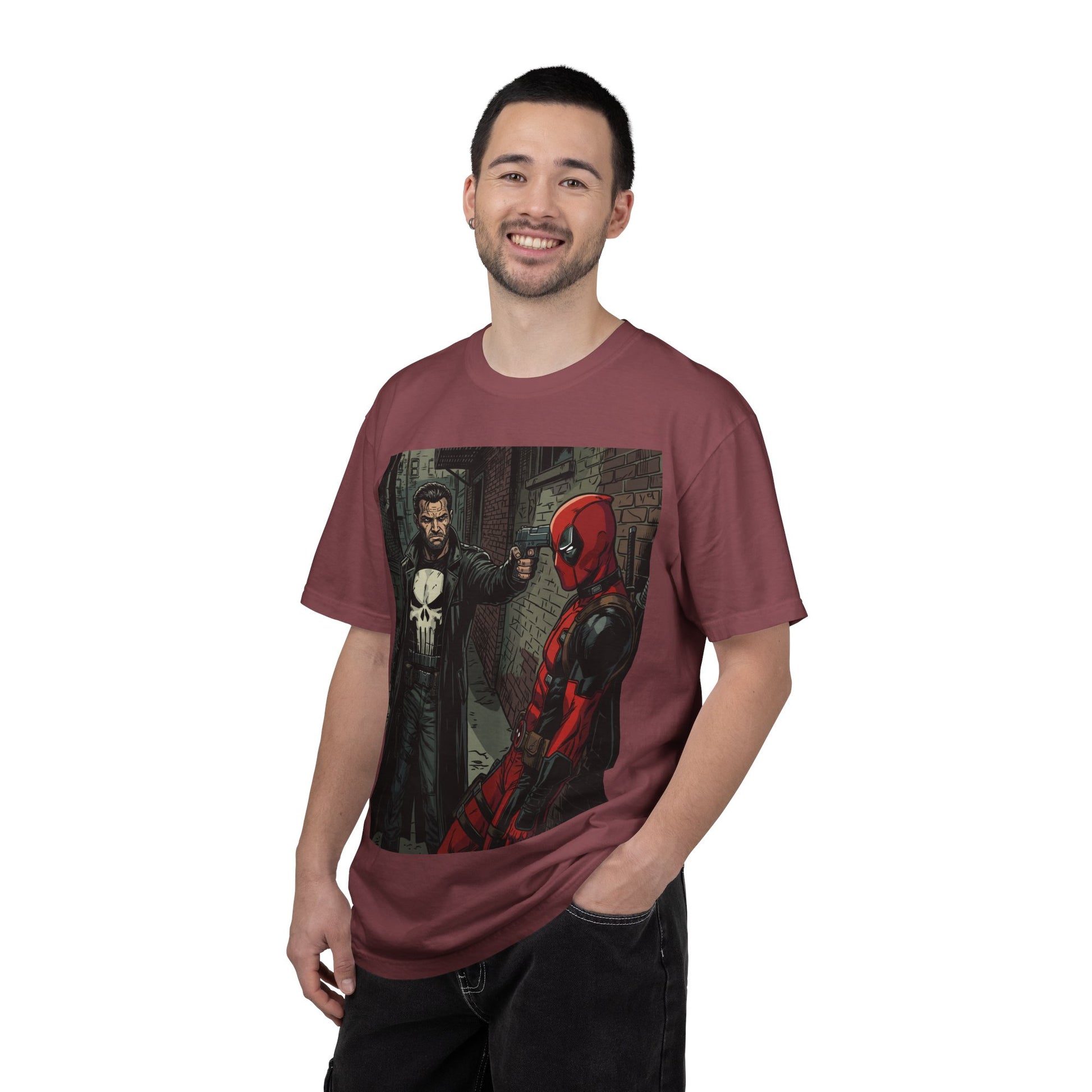 This heavyweight cotton tee carries an urban, comic-book mood. The garment-dyed fabric feels broken-in from day one, settling into a relaxed silhouette that moves with you. A bold, graphic print on the chest delivers cinematic, street-level energy — like a rainy-night standoff in an alley — while the sturdy double-needle stitching and tubular knit keep the shirt holding its shape through repeat wear. It wears like a favorite from the first wash and pairs naturally with denim, hoodies, or layered under a leather jacket for an edge-ready look.